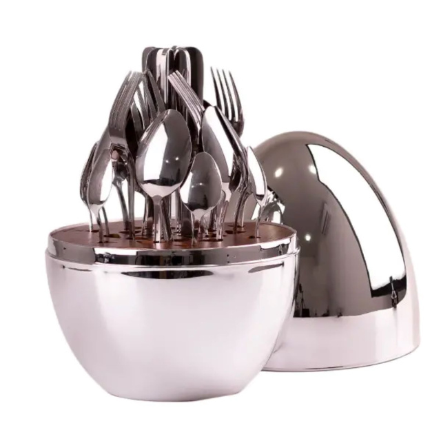 Набор столовых приборов в оригинальном кейсе – это отличный вариант как для праздничного сервирования, так и для повседневного использования. Набор рассчитан на 6 персон и включает: 6 столовых ножей, 6 столовых ложек, 6 десертных ложек и 6 столовых вилок. Приборы изготовлены из высококачественной нержавеющей стали и имеют лаконичный дизайн. Кейс отличается зеркальной поверхностью и выполнен из пластика. Набор столовых приборов в форме яйца сочетает функциональность и эстетику, делая сервировку стола более удобной и красивой. Основные характеристики набора столовых приборов в яйце: Высота: 29 см Диаметр: 19.5 см Основные характеристики приборов: Длина ножей: 22.5 см Длина ложек: 20 см Длина вилок: 20 см Длина чайных ложек: 13.5 см Преимущества набора столовых приборов: Удобство: все приборы всегда под рукой в аккуратном порядке благодаря удобной подставке Функциональность: набор включает все необходимые приборы для сервировки стола Эстетика: стильный и современный вид, который украшает вашу кухню Качество: изготовлен из высококачественных материалов, которые прослужат долгие годы