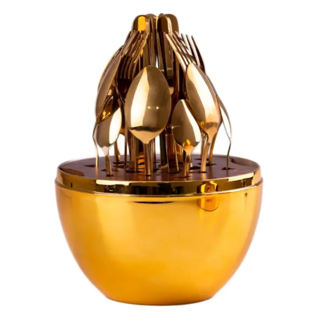 Набор столовых приборов в оригинальном кейсе – это отличный вариант как для праздничного сервирования, так и для повседневного использования. Набор рассчитан на 6 персон и включает: 6 столовых ножей, 6 столовых ложек, 6 десертных ложек и 6 столовых вилок. Приборы изготовлены из высококачественной нержавеющей стали и имеют лаконичный дизайн. Кейс отличается зеркальной поверхностью и выполнен из пластика. Набор столовых приборов в форме яйца сочетает функциональность и эстетику, делая сервировку стола более удобной и красивой. Основные характеристики набора столовых приборов в яйце: Высота: 29 см Диаметр: 19.5 см Основные характеристики приборов: Длина ножей: 22.5 см Длина ложек: 20 см Длина вилок: 20 см Длина чайных ложек: 13.5 см Преимущества набора столовых приборов: Удобство: все приборы всегда под рукой в аккуратном порядке благодаря удобной подставке Функциональность: набор включает все необходимые приборы для сервировки стола Эстетика: стильный и современный вид, который украшает вашу кухню Качество: изготовлен из высококачественных материалов, которые прослужат долгие годы