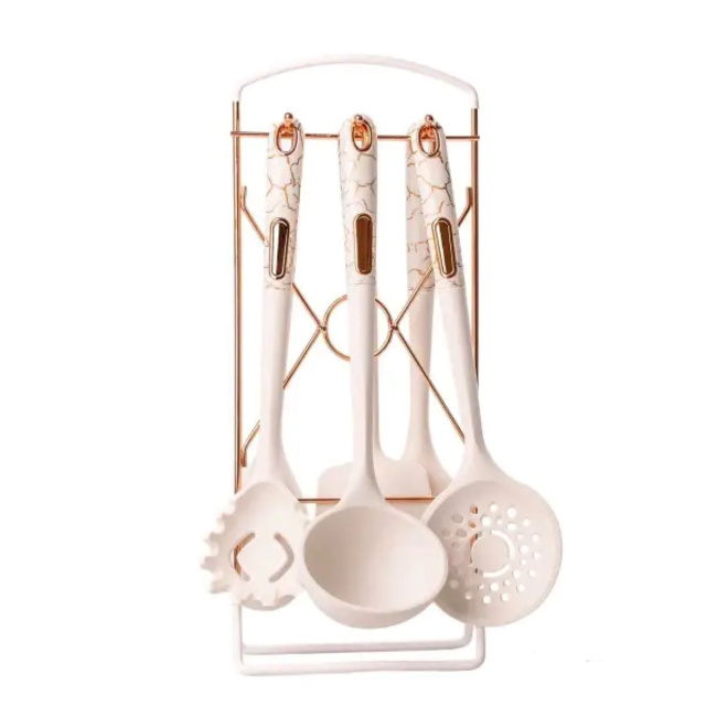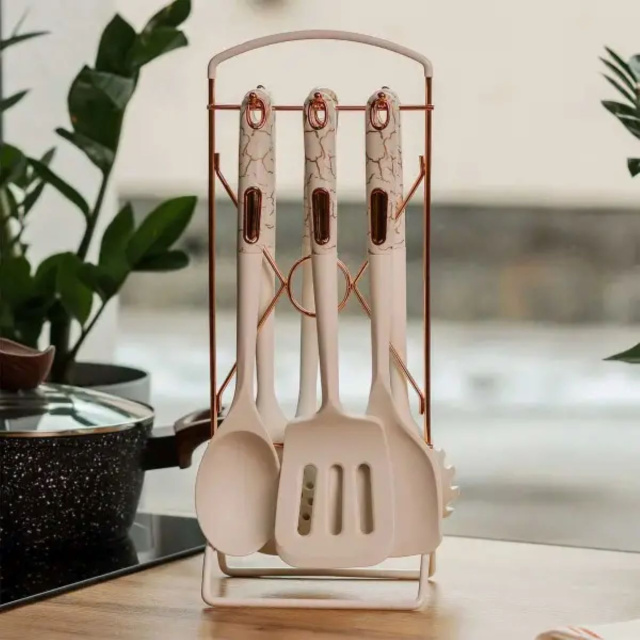 Набор кухонных принадлежностей на подставке включает шесть стильных аксессуаров в мраморном дизайне: половник, кухонные лопатки, поварскую ложку, шумовку, ложку для спагетти. Этот элегантный комплект имеет современный вид и приятный на ощупь материал, что придает кухне стильный акцент. Характеристики: Материал: пищевой пластик, силикон Включает: половник, кухонные лопатки, поварскую ложку, шумовку, ложку для спагетти, подставку Размер приборов: 32,5 см Преимущества: Элегантный дизайн: современный мраморный вид, подчеркивающий стиль вашей кухни. Функциональность: удобная подставка для организации и легкого доступа к инструментам. Приятные на ощупь материалы: обеспечивают комфорт во время использования. Уход: Не мойте принадлежности в посудомоечной машине Используйте мягкие моющие средства Тщательно высушивайте после мытья Храните в сухом месте