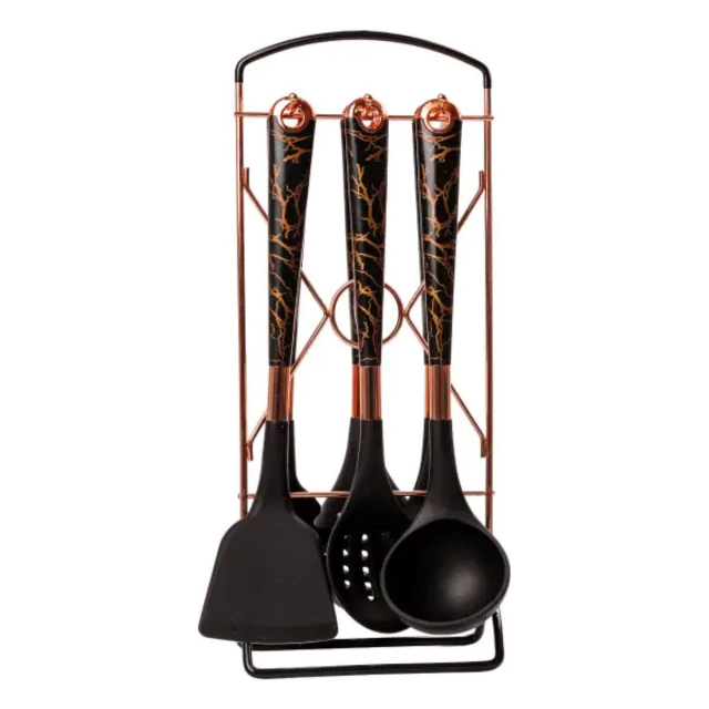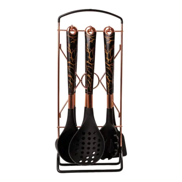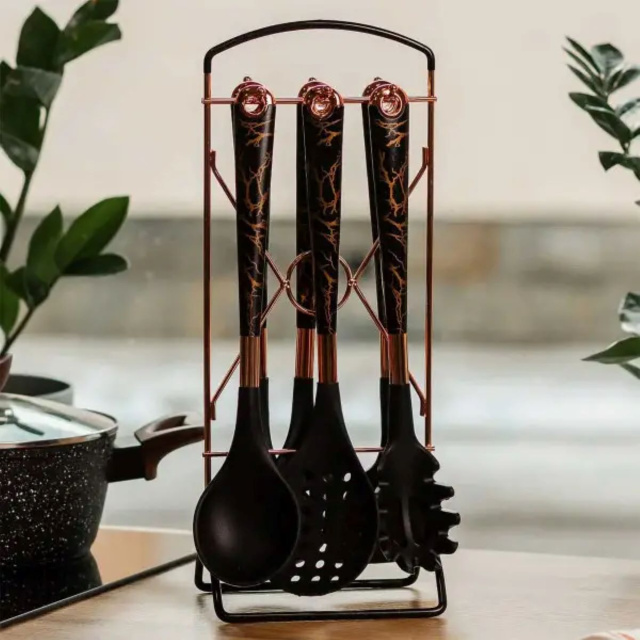Набор кухонных принадлежностей на подставке включает шесть стильных аксессуаров: поварскую ложку, шумовку, ложку для спагетти, кухонную лопатку, ложку для салата. Этот элегантный комплект не только выглядит стильно, но и приятен на ощупь, добавляя современный акцент в вашу кухню. Удобная подставка позволяет организовать и легко достать необходимые инструменты, поддерживая порядок на кухне. Набор длиной 32,5 см станет не только функциональным, но и декоративным дополнением вашего кухонного интерьера. Преимущества: Стильный дизайн для элегантного вида Высокий уровень комфорта и функциональности Удобная подставка для организации Характеристики: Включает: поварскую ложку, шумовку, ложку для спагетти, кухонную лопатку, ложку для салата, подставку Длина приборов: 32,5 см Уход: Не мойте в посудомоечной машине Используйте мягкие моющие средства Тщательно высушивайте после мытья Храните в сухом месте