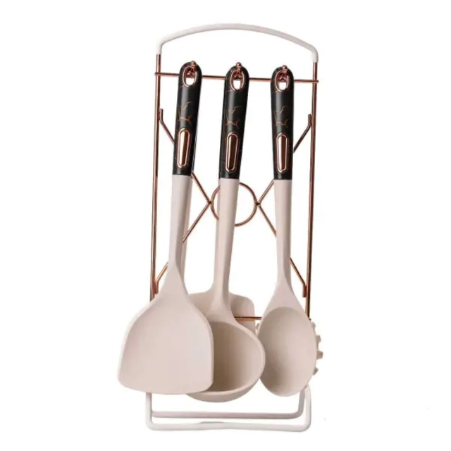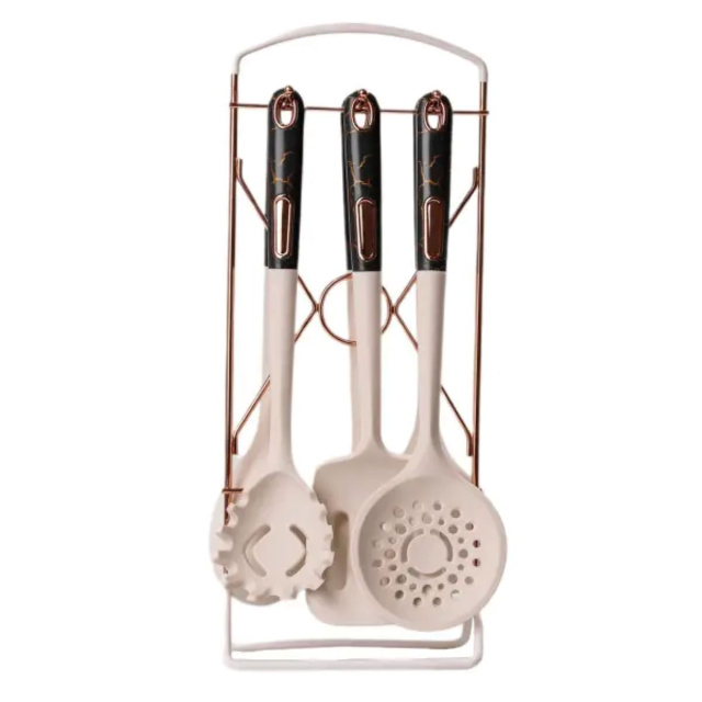 Набор кухонных принадлежностей на подставке включает шесть стильных аксессуаров в мраморном дизайне: половник, кухонные лопатки, поварскую ложку, шумовку, ложку для спагетти. Этот элегантный комплект имеет современный вид и приятный на ощупь материал, что придает кухне стильный акцент. Характеристики: Материал: пищевой пластик, силикон Включает: половник, кухонные лопатки, поварскую ложку, шумовку, ложку для спагетти, подставку Размер приборов: 32,5 см Преимущества: Элегантный дизайн: современный мраморный вид, подчеркивающий стиль вашей кухни. Функциональность: удобная подставка для организации и легкого доступа к инструментам. Приятные на ощупь материалы: обеспечивают комфорт во время использования. Уход: Не мойте принадлежности в посудомоечной машине Используйте мягкие моющие средства Тщательно высушивайте после мытья Храните в сухом месте