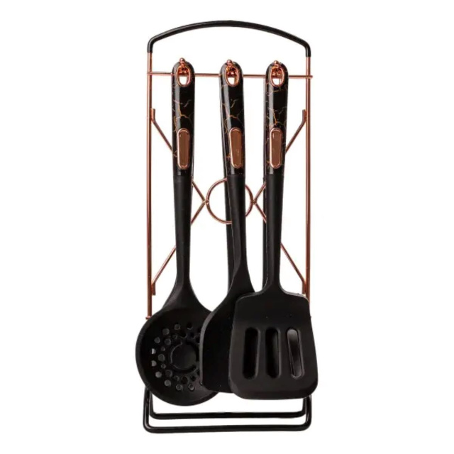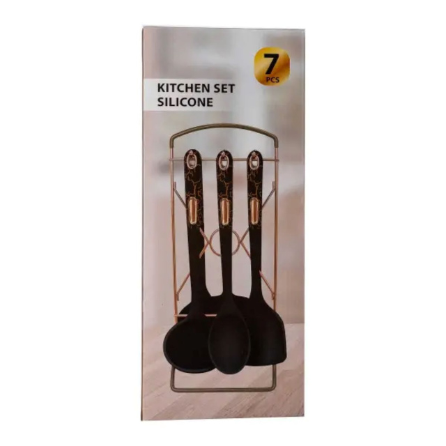 Набор кухонных принадлежностей на подставке включает шесть стильных аксессуаров в мраморном дизайне: половник, кухонные лопатки, поварскую ложку, шумовку, ложку для спагетти. Этот элегантный комплект имеет современный вид и приятный на ощупь материал, что придает кухне стильный акцент. Характеристики: Материал: пищевой пластик, силикон Включает: половник, кухонные лопатки, поварскую ложку, шумовку, ложку для спагетти, подставку Размер приборов: 32,5 см Преимущества: Элегантный дизайн: современный мраморный вид, подчеркивающий стиль вашей кухни. Функциональность: удобная подставка для организации и легкого доступа к инструментам. Приятные на ощупь материалы: обеспечивают комфорт во время использования. Уход: Не мойте принадлежности в посудомоечной машине Используйте мягкие моющие средства Тщательно высушивайте после мытья Храните в сухом месте
