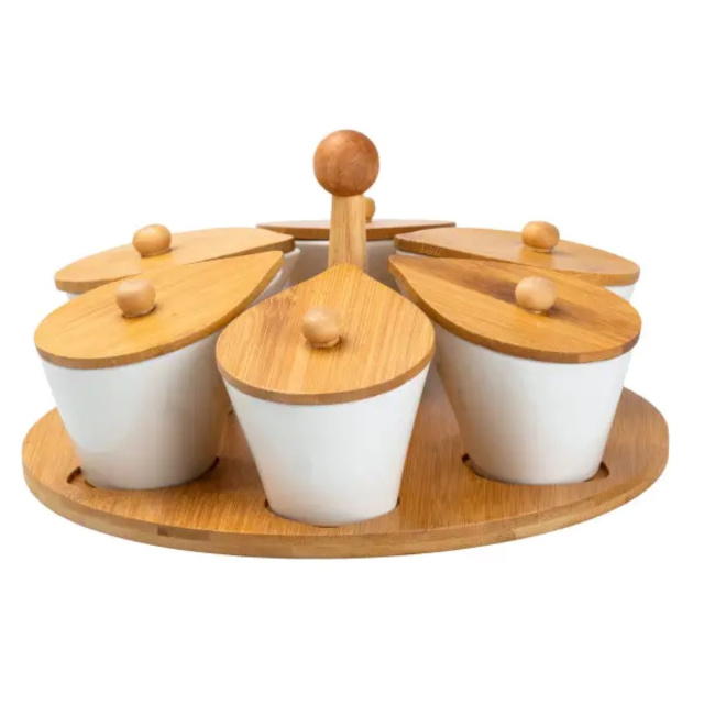 Набор из шести фарфоровых баночек на бамбуковой подставке станет не только практичным, но и элегантным дополнением вашей кухни. Баночки изготовлены из фарфора, что обеспечивает их прочность и устойчивость к царапинам. Бамбуковые крышки надежно сохраняют свежесть продуктов в течение длительного времени. Характеристики: Количество баночек: 6 шт. Материал баночек: фарфор. Материал крышек: Бамбук. Подставка: Бамбуковая. Основные преимущества: Практичность: Идеален для хранения круп, макарон, сахара, кофе, чая, специй и других сыпучих продуктов. Устойчивость: фарфоровые баночки устойчивы к царапинам и имеют длительную службу. Организованное хранение: Бамбуковая подставка обеспечивает компактное и устойчивое хранение баночек, экономя место. Элегантный дизайн: Лаконичный стиль гармонично впишется в любой интерьер кухни. Уход: Рекомендуется мыть баночки вручную. Подставку можно протирать влажной тряпкой. Этот набор станет отличным подарком для любой хозяйки, которая ценит практичность и эстетику. С ним ваша кухня станет не только уютной, но и безупречно опрятной.