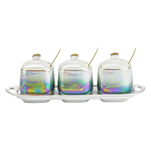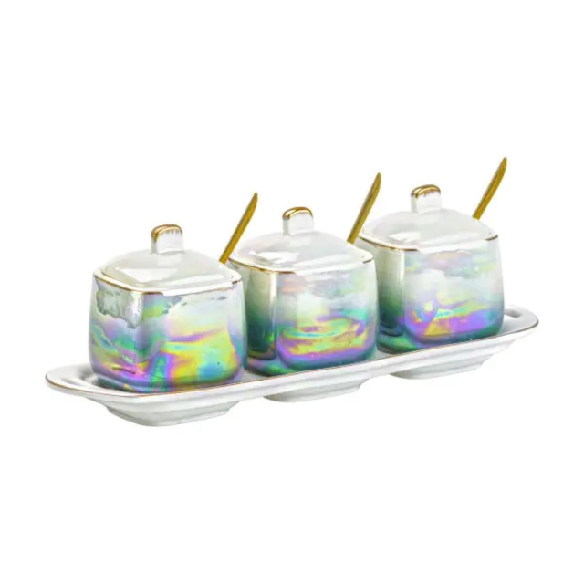 Практичный и стильный набор из трех фарфоровых баночек для специй с крышками и ложками, станет прекрасным дополнением к вашей кухне. Он поможет вам организовать ваши специи, сохранить их свежесть, а также сэкономить место. Баночки и подставка изготовлены из высококачественного фарфора. Баночки имеют одинаковый объем в 300 мл и форму, которая придает им элегантности и привлекательности. Крышки плотно закрываются и предотвращают проникновение воздуха и влаги, сохраняя свежесть специй в течение длительного времени. Набор также включает три удобные ложки из нержавеющей стали, которые помогут дозировать специи. Баночки и крышки легко чистить, они не требуют особого ухода. Этот набор станет отличным подарком для любого любителя готовить. Характеристики: Материал: фарфор (банки), нержавеющая сталь (ложки) Цвет: Радужный (банки), золотистый (ложки) Объем: 300 мл (каждая банка