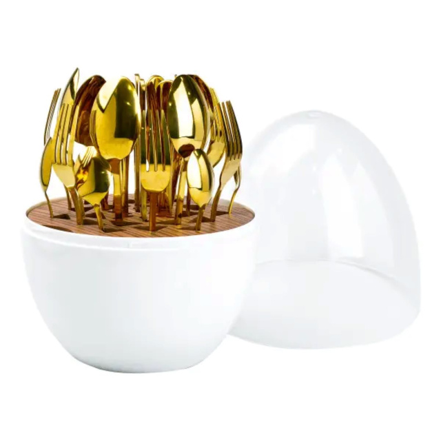 Этот изысканный набор столовых приборов, состоящий из 24 предметов, станет настоящим украшением вашей кухни. Изготовленные из высококачественной нержавеющей стали с золотым покрытием, приборы отличаются элегантным классическим дизайном и безупречным качеством. Они не тускнеют со временем, сохраняя блеск и красоту в течение долгих лет. Эргономичные ручки приборов удобно ложатся в руку, обеспечивая комфорт во время употребления пищи. Дополнительно, элегантная подставка в форме яйца не только экономит место на столе, но и добавляет стиля вашей сервировке. Характеристики: Тип: набор столовых приборов Материал: нержавеющая сталь с золотым покрытием Количество человек: 6 Столовый нож: 6 шт, длина 22.5 см Столовая ложка: 6 шт, длина 20 см Чайная ложка: 6 шт, длина 13.5 см Столовая вилка: 6 шт, длина 20 см Особенности: с подставкой в форме яйца Преимущества: Высококачественная нержавеющая сталь с золотым покрытием для долговечности и элегантности Элегантный классический дизайн, который придает роскошный вид Эргономичные ручки для комфортного использования Стильная подставка для удобства хранения и эстетического оформления сервировки Уход: Рекомендуется мытье вручную с мягкими моющими средствами для сохранения блеска и избежания царапин.
