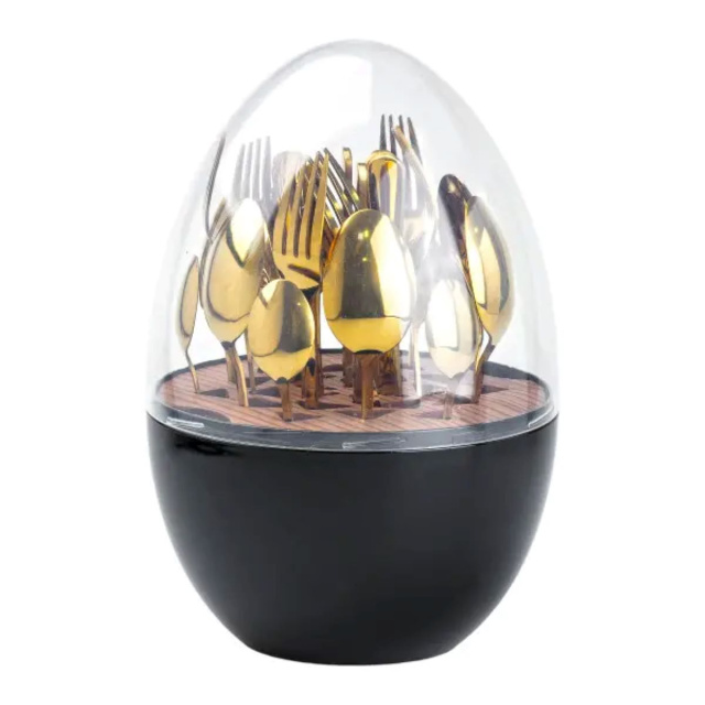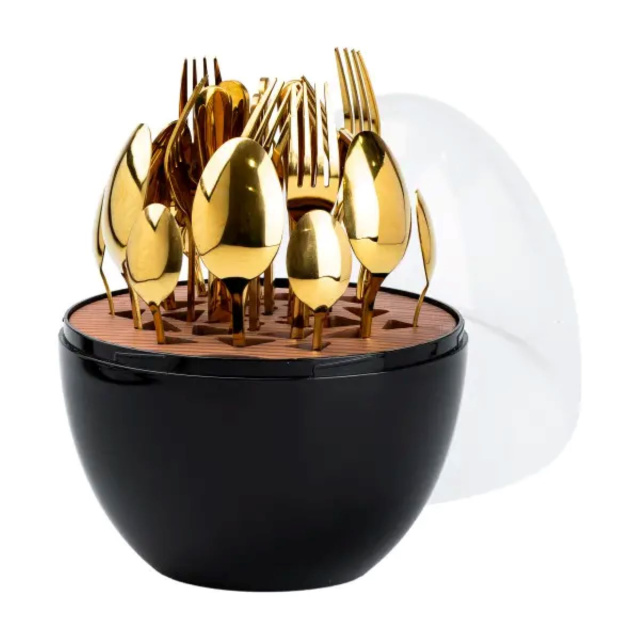 Этот изысканный набор столовых приборов из 24 предметов станет настоящим украшением вашей кухни. Изготовленные из высококачественной нержавеющей стали с золотым покрытием, приборы отличаются элегантным классическим дизайном и безупречным качеством. Они не тускнеют со временем, сохраняя блеск и красоту на протяжении долгих лет. Эргономичные ручки приборов удобно ложатся в руку, что делает процесс употребления пищи комфортным. Дополняет набор элегантная подставка в форме яйца, которая не только экономит место на столе, но и добавляет изысканности сервировке. Характеристики: Тип: столовые приборы Материал: нержавеющая сталь с золотым покрытием Количество человек: 6 Столовый нож: 6 шт Столовая ложка: 6 шт Чайная ложка: 6 шт Столовая вилка: 6 шт Особенности: с подставкой Размеры: Длина ножей: 22.5 см Длина столовых ложек: 20 см Длина вилок: 20 см Длина чайных ложек: 13.5 см Преимущества: Высококачественная нержавеющая сталь с золотым покрытием Элегантный классический дизайн Эргономичные ручки для комфорта Элегантная подставка для экономии места и украшения стола Уход: Для сохранения блеска и качества используйте моющие средства без агрессивных абразивов. Рекомендуется ручная стирка для долгосрочного использования.