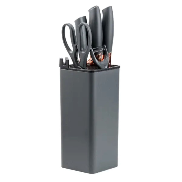 Этот набор кухонных ножей из 7 предметов станет незаменимым помощником на вашей кухне. Он обеспечивает все необходимое для приготовления пищи, от нарезания мяса и овощей до очистки фруктов и зелени. Ножи изготовлены из высококачественной нержавеющей стали, устойчивой к коррозии и повреждениям, с острыми лезвиями, которые легко режут. Удобные ручки не скользят в руке, обеспечивая комфорт во время использования. Характеристики: Материал лезвий: высококачественная нержавеющая сталь. Ручки: удобные, не скользят. Подставка: компактная, с интегрированной точилкой. Преимущества: Устойчивость к коррозии и повреждениям. Лезвия с острым резом. Интегрированное точило для поддержания остроты лезвий. Компактное размещение на подставке, что экономит место. Уход: Очистка ножей мягкими моющими средствами. Регулярное использование точилки для поддержания остроты лезвий. Набор содержит: Поварской нож Нож для хлеба Нож для мяса Универсальный нож Нож для нарезки Кухонные ножницы Овощерезка