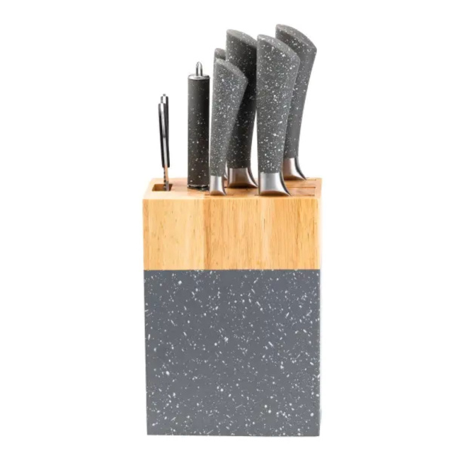 Набор кухонных ножей на подставке из 8 предметов - это удобный и практичный инструмент, который станет незаменимым на любой кухне. Набор включает 8 ножей различного назначения и удобную подставку для их хранения. Ножи изготовлены из высококачественной нержавеющей стали, которая отличается прочностью, устойчивостью к коррозии и точностью заточки. Острые и долговечные лезвия позволяют легко справляться с любыми продуктами, а подставка из дерева и пластика обеспечивает удобное и компактное хранение ножей. Характеристики: Материал лезвий: высококачественная нержавеющая сталь. Подставка: комбинация дерева и пластика, устойчивое дно, отверстия для каждого ножа. Преимущества: Устойчивость к коррозии и точность заточки. Острые и долговечные лезвия. Удобное хранение благодаря подставке с отверстиями. Уход: Очистка ножей мягкими моющими средствами. Регулярная очистка и просушивание подставки для предотвращения износа. Набор содержит: Нож универсальный Нож поварской Нож для нарезки Овощной нож Кухонные ножницы Кухонный топорик Мусат Подставка