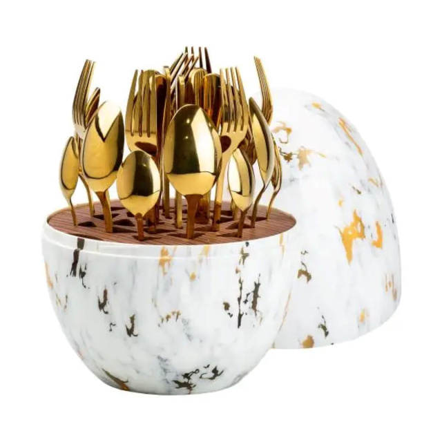 Этот элегантный набор столовых приборов из 24 предметов изготовлен из высококачественной нержавеющей стали с золотистым покрытием, что придает ему роскошный вид. Набор станет отличным дополнением к любой кухне и подойдет как для повседневного использования, так и для праздничных обедов. Приборы имеют классический дизайн с гладкими ручками, которые не тускнеют со временем. Они удобно лежат в руке и приятны на ощупь. Характеристики: Тип: набор столовых приборов Материал: нержавеющая сталь с золотистым покрытием Количество персон: 6 Столовый нож: 6 шт, длина 22.5 см Столовая ложка: 6 шт, длина 20 см Чайная ложка: 6 шт, длина 13.5 см Столовая вилка: 6 шт, длина 20 см Особенности: с подставкой Преимущества: Высококачественная нержавеющая сталь с золотистым покрытием для роскошного вида Классический дизайн с гладкими ручками, которые удобны в использовании Устойчивость к потускнению и легкость в уходе Уход: Мыть в посудомоечной машине с использованием мягких моющих средств для сохранения блеска и предотвращения царапин.