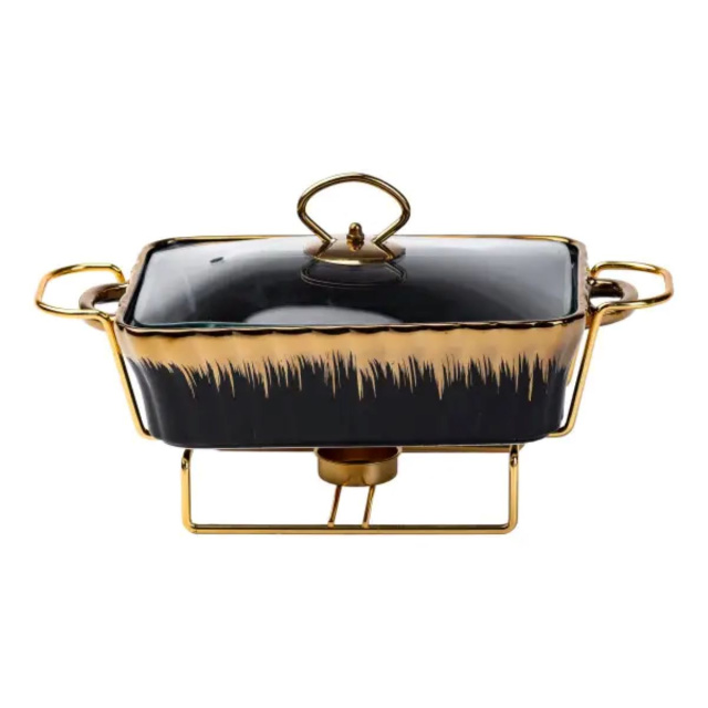 фарфоровая прямоугольная мармитница объемом 1 л является изысканным и функциональным дополнением к вашему кухонному арсеналу. Изготовленная из высококачественного фарфора, она обеспечивает равномерный нагрев и долговременное сохранение тепла, что делает ее идеальной для подачи горячих блюд непосредственно на стол. Черное покрытие придает современный вид, а золотистая отделка по краям придает изящества и роскоши, делая ее отличным выбором как для повседневного использования, так и для праздничных мероприятий. Стеклянная крышка позволяет контролировать процесс приготовления, сохраняя тепло и аромат блюд. Характеристики: Размеры: 31*16*11смОбъем: 1 лМатериал: фарфор, стекло, нержавеющая сталь Преимущества: Мармитница оснащена металлической подставкой с подогревом, которая позволяет поддерживать оптимальную температуру блюда во время подачи. Прочная металлическая подставка гарантирует стабильность и надежность конструкции, добавляя элегантности и удобства сервировке. Это делает мармитницу центральным элементом любого стола. Уход: Рекомендуется ручная мойка с использованием мягких моющих средств. Избегайте резких перепадов температуры, чтобы сохранить долговечность покрытия и материалов.