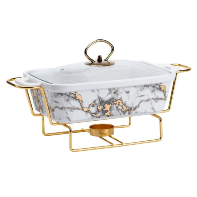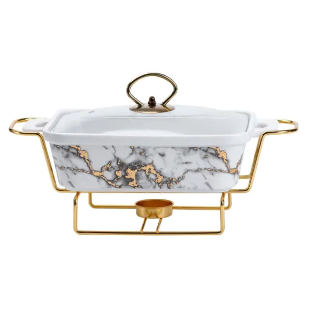 Прямоугольный мармит с подогревом на металлической подставке – идеальный выбор для банкетов и праздничных мероприятий. Металлическая подставка обеспечивает надежную поддержку и удобство при подаче блюд, а мармитница поддерживает температуру пищи, сохраняя её аромат. Основные характеристики: Объем: 1 литр Размеры: 31×16×11 см Преимущества: фарфоровый материал сочетает практичность и эстетичность Подходит для различных стилей сервировки Уход: Рекомендуется использовать моющие средства Ручная стирка для сохранения внешнего вида