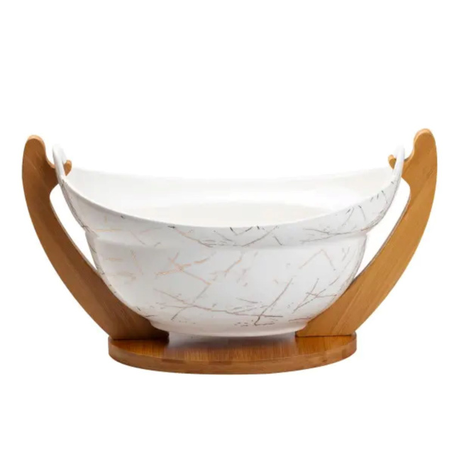 Фруктовница изготовлена из высококачественного фарфора, имеет стильный белый мраморный дизайн с золотистыми вкраплениями, придающими ей особый шарм и роскошь. Такой изящный вид делает ее идеальным дополнением к любому интерьеру, привлекая внимание своим эстетическим оформлением. Оригинальная бамбуковая подставка придает фруктовнице природной теплоты и обеспечивает ее стабильность. Бамбук, как экологически чистый материал, подчеркивает естественную красоту изделия и добавляет нотку современности. Благодаря своему дизайну, фруктовница удобно подходит для хранения и подачи различных фруктов, создавая уютную атмосферу на вашем столе. Практичность и элегантность этого изделия делают его отличным выбором для любого дома. Фруктовница не только украшает стол, но и помогает организовать пространство, поддерживая порядок и красоту в вашей кухне. Она станет отличным подарком для тех, кто ценит сочетание стиля и функциональности в повседневной жизни. Характеристики: Материал салатницы: фарфор Материал подставки: Бамбук Размеры: 31.5*18.5*17.5 см