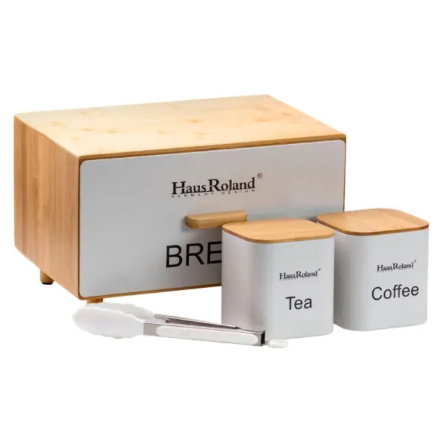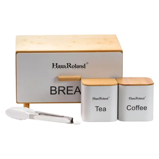 Набор для хранения продуктов Haus Roland - это стильное и функциональное решение для организации кухонного пространства. В комплект входят вместительная хлебница, две баночки и кухонные щипцы, обеспечивающие оптимальное хранение и легкий доступ к вашим продуктам. Характеристики: Материал: Нержавеющая сталь, бамбук Размеры хлебницы: 35,5 × 24 × 18 см Высота банок: 12,5 см Объем банок: 1 литр Преимущества: Хлебница с бамбуковым корпусом: Хлебница изготовлена из бамбука и имеет плотное закрытие, что позволяет надолго сохранить свежесть хлебобулочных изделий и другой сдобы. Бамбук добавляет эстетики и натурального вида, а также легко чистится. Банки из нержавеющей стали: Банки изготовлены из высококачественной нержавеющей стали, которая не впитывает запахи, легко чистится и не влияет на содержимое. Крышки банок оснащены силиконовыми уплотнителями, обеспечивающими защиту от влаги и посторонних запахов. Кухонные щипцы: Щипцы дополняют набор, обеспечивая удобный доступ к продуктам и их обработку. Стильный дизайн: Все предметы имеют современный и элегантный вид, что позволяет им гармонично вписаться в любой кухонный интерьер. Уход: Мойте в теплой воде с мягким моющим средством. Протирайте сухой тканью после мытья. Не используйте абразивные средства для чистки. Этот набор станет практичным и стильным дополнением любой кухни, помогая поддерживать порядок и сохранять свежесть ваших продуктов.