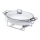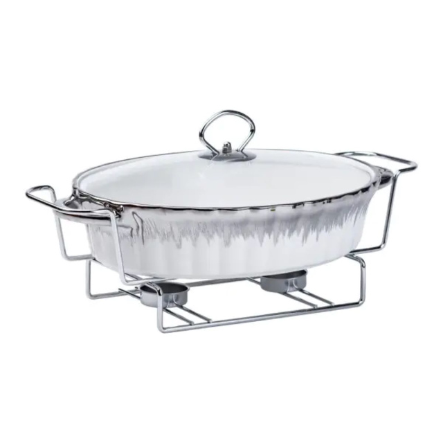 фарфоровая овальная мармитница объемом 1.5 литра – элегантный и функциональный аксессуар для вашей кухни. Изготовлена из высококачественного фарфора белого цвета с серебристым покрытием по краям, она выглядит изящно и стильно. Стеклянная крышка обеспечивает сохранение тепла и аромата блюд, позволяя наслаждаться идеально приготовленной едой. Характеристики: Размеры: 35.5*22*14 см Объем: 1.5 литр Материал: фарфор, стекло, нержавеющая сталь Достоинства: Хромированная металлическая подставка с подогревом поддерживает блюда теплыми в течение всего времени подачи. Эстетический дизайн придает изяществу и стилю сервировку стола. Уход: Рекомендуется использовать моющие средства Ручная мойка для сохранения вида фарфора и стекла