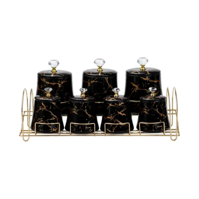Обновите вид и функциональность вашей кухни с нашим элегантным набором баночек для сыпучих продуктов. В комплект входят три банки объемом 600 мл и четыре банки объемом 250 мл, которые идеально подходят для хранения специй, круп, чая и сахара. Черная керамика с золотистыми прожилками придает им стильный вид, а стеклянные ручки крышек добавляют нотку изысканности и удобства. Металлическая подставка обеспечивает компактное хранение и поддерживает порядок на кухне, подчеркивая элегантность вашего интерьера. Характеристики: Материал банок: Керамика Материал подставки: Бамбук Высота банок: 18 см Объем банок: 600/250 мл Преимущества: Стильный дизайн, дополняющий любой интерьер Удобное хранение и легкий доступ к продуктам Прочность и долговечность керамических банок Уход:Рекомендуется очищать баночки мягкими моющими средствами и теплой водой. Избегайте использования абразивных материалов для сохранения эстетического вида.