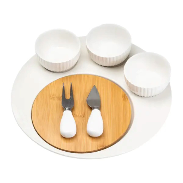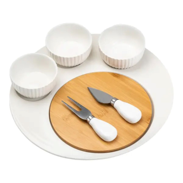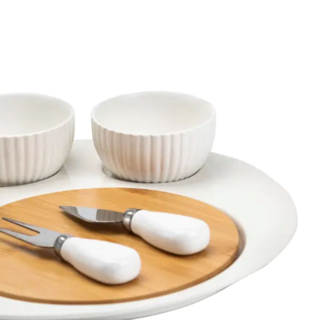Превратите ваши вечеринки и посиделки в настоящий праздник с нашим изысканным набором для подачи фруктов и сыра. Этот набор включает керамическую подставку с изящной бамбуковой доской, идеально подходит для сервировки и нарезки сыра и фруктов. Три керамические блюдца удобно размещаются на подставке, позволяя сервировать различные вкусности в эстетическом порядке. Универсальный нож для сыра обеспечивает легкость нарезки различных видов сыра, позволяя вам без труда создавать идеальные ломтики. Вилка для подачи добавляет набору завершенности и комфорта в использовании, делая процесс подачи еще более приятным и удобным. Этот набор станет прекрасным дополнением к вашему столу, сочетая функциональность и эстетический вид, и обеспечивая вам и вашим гостям незабываемые впечатления от трапезы. Характеристики: Материал: керамика/бамбук Объем одной пиалы: 100 мл Диаметр: 29 см