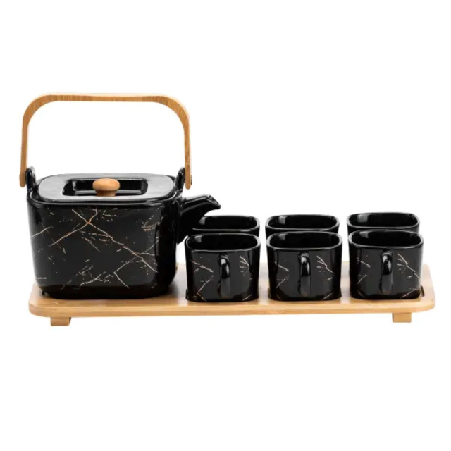 Чайный сервиз на подставке для шести человек - это идеальное сочетание стиля, комфорта и эстетики. Чайник и шесть чашек выполнены в стильном черном мраморном дизайне с золотистыми линиями, что придает им современный вид. Чайник оснащен удобной деревянной ручкой, которая обеспечивает безопасное и комфортное использование во время наливания горячего напитка. Чашки имеют компактную форму и удобно размещаются на бамбуковой подставке, что добавляет набору естественной эстетики. Характеристики: Размер сервиза: 37×17×20 см Объем чашки: 110 мл Объем чайника: 1200 мл Материал подставки: Бамбук Преимущества: Стильный черный мраморный дизайн с золотистыми акцентами подчеркивает современный вид набора. Деревянная ручка чайника обеспечивает удобство и безопасность во время использования. Бамбуковая подставка добавляет набору естественной эстетики и позволяет удобно хранить чашки. Уход: Рекомендуется мыть вручную, используя неабразивные моющие средства и мягкие губки, чтобы сохранить эстетический вид и долговечность сервиза.