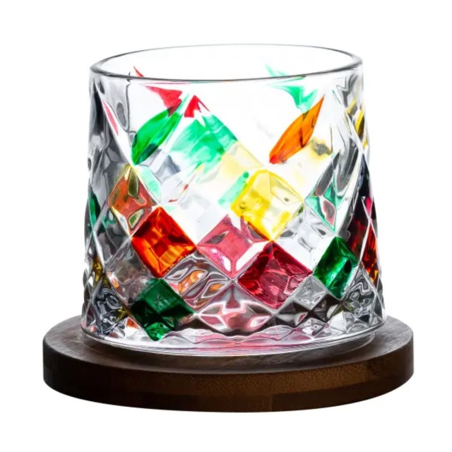Вращающийся стакан для виски станет идеальным выбором для ценителей виски, которые ищут стильный и функциональный аксессуар. Изготовленный из прозрачного стекла с фасетованной текстурой, он имеет объем 300 мл и геометрический дизайн, обеспечивающий удобный захват и комфорт в руке. Стакан установлен на круглой подставке из натурального бамбука, что придает ему элегантности и стабильности. Основные характеристики: Объем: 300 мл Размер: 85×85×90 мм Верхний диаметр: 80 мм Нижний диаметр: 85 мм Материал: Прозрачное стекло, бамбук Преимущества: Геометрический дизайн: Обеспечивает удобный захват и комфорт. Вращение: Стакан вращается вокруг своей оси, что позволяет удобно крутить его одной рукой и способствует аэрации напитка, раскрывая его букет. Элегантная подставка: Круглая подставка из натурального бамбука добавляет изысканности и устойчивости. Уход: Мытье: Стакан можно мыть вручную или в посудомоечной машине. Рекомендации: Используйте неабразивные моющие средства для сохранения его вида. Стакан для виски, вращающийся станет оригинальным дополнением к домашнему бару или замечательным подарком для любителя виски.