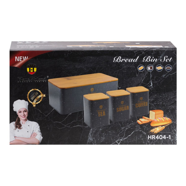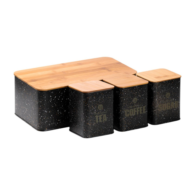 Хлебница с банками для хранения сыпучих продуктов - это стильный и практичный набор для вашей кухни. Комплект включает три баночки для чая, сахара и кофе, а также хлебницу. Деревянные крышки обеспечивают герметичность, что помогает сохранять аромат и свежесть продуктов. Банки имеют элегантный черный цвет с золотистыми надписями, что добавляет утонченности интерьеру. Характеристики: Размеры хлебницы: 33,5 × 18,5 × 13 см Размеры баночек для сыпучих продуктов: 10 × 10 × 13,5 см Объем баночек: 1 л Преимущества: Универсальность: банки подходят для хранения различных сыпучих продуктов. Элегантный дизайн: черный цвет и золотистые надписи добавляют стиля. Функциональность: деревянные крышки обеспечивают герметичность и сохраняют свежесть продуктов. Уход: Очищайте банки и хлебницу влажной тканью. Не подлежит мытью в посудомоечной машине. Сушите перед хранением в сухом месте.