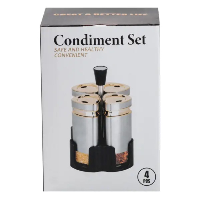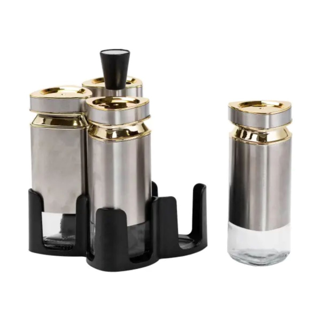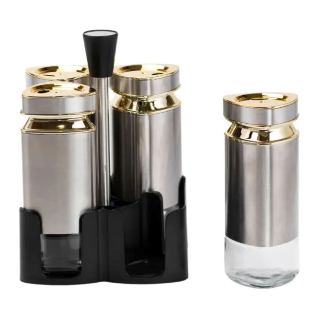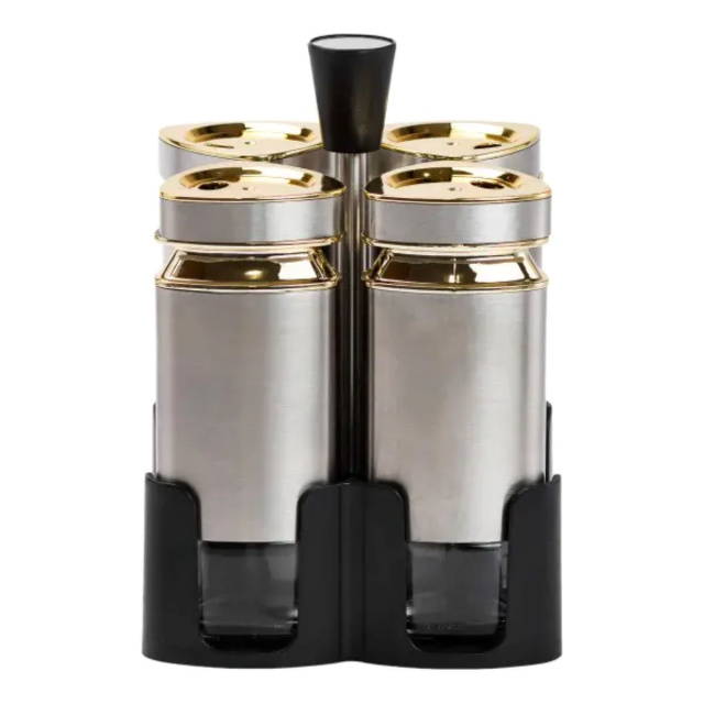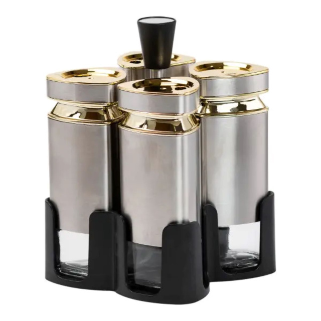 Комплект, изготовленный из пластика и стекла, включает четыре банки для специй и удобную подставку с ручками. Банки из стекла не впитывают запахи, что позволяет сохранять специи свежими и вкусными. Этот комплект для специй станет эффектным дополнением к вашей кухне, ведь подставка надежно удерживает емкости, предотвращая их выскальзывание, и придает кухне компактный и аккуратный вид. Характеристики и преимущества Размер: 11,5 х 11,5 х 16 см Объем контейнеров: 120 мл Материал контейнеров: стекло и пластик Материал подставки: пластик Простота в использовании с акцентом на внимание к деталям Меры безопасности Для поддержания длительного использования рекомендуется мыть банки вручную, избегая абразивных чистящих средств. Не оставляйте комплект на прямом солнце, чтобы избежать деформации пластика.