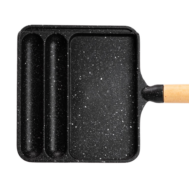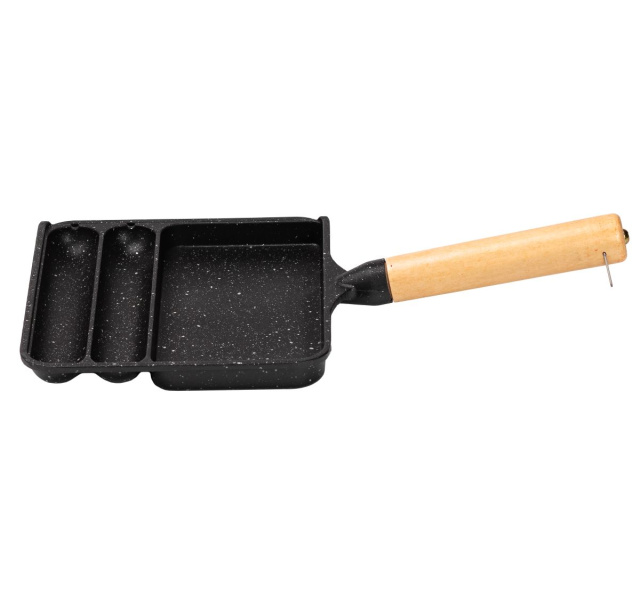 Сковорода прямоугольная на 3 секции – практичный инструмент для приготовления разнообразных блюд. Изготовлена из алюминия с антипригарным покрытием, она разделена на три секции, что позволяет одновременно готовить несколько различных ингредиентов без смешивания вкусов. Удобная не нагреваемая ручка защищает ваши руки от ожогов. Антипригарное покрытие предотвращает пригорание, позволяя готовить без использования растительного масла. Благодаря толстому дну сковорода обеспечивает идеальное рассеяние тепла, что способствует равномерному приготовлению блюд с насыщенным ароматом. Эта сковорода станет незаменимым помощником на вашей кухне, обеспечивая удобство и эффективность приготовления пищи. Рекомендации по использованию сковороды: Рекомендуется готовить на малом или среднем огне. Чтобы защитить поверхность от царапин, используйте силиконовые или деревянные столовые приборы. Категорически не рекомендуется использовать металлические ложки и кухонные лопатки. Чтобы избежать повреждения, следует мыть сковороду только после полного охлаждения, не использовать жесткие мочалки, щетки, абразивные пасты и чистящие порошки, агрессивные вещества. Основные характеристики сковороды: размер сковороды 21×18.5×2 см; высота стенок сковороды 2 см; объем большей секции 250 мл; объем меньших секций по 100 мл; толщина стен 4 мм; материал ручки – бакелит; антипригарное покрытие. Преимущества сковороды: сковорода подходит для газовых и электрических плит; безопасное антипригарное покрытие без вредных соединений; гранитное покрытие для предотвращения прилипания пищи и равномерного распределения тепла; эргономичная ручка, которая не нагревается в процессе приготовления; прямоугольная форма для экономии места на варочной поверхности.