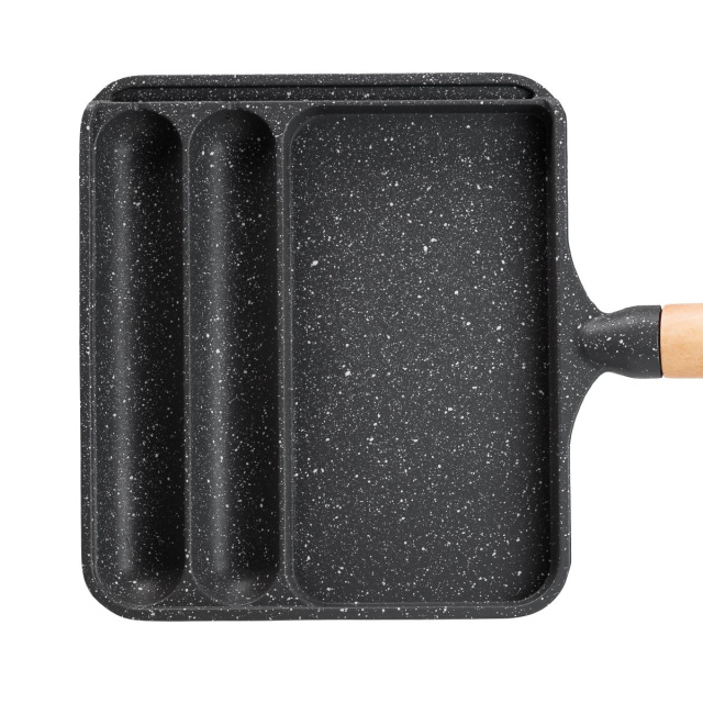 Сковорода прямоугольная на 3 секции – практичный инструмент для приготовления разнообразных блюд. Изготовлена из алюминия с антипригарным покрытием, она разделена на три секции, что позволяет одновременно готовить несколько различных ингредиентов без смешивания вкусов. Удобная не нагреваемая ручка защищает ваши руки от ожогов. Антипригарное покрытие предотвращает пригорание, позволяя готовить без использования растительного масла. Благодаря толстому дну сковорода обеспечивает идеальное рассеяние тепла, что способствует равномерному приготовлению блюд с насыщенным ароматом. Эта сковорода станет незаменимым помощником на вашей кухне, обеспечивая удобство и эффективность приготовления пищи. Рекомендации по использованию сковороды: Рекомендуется готовить на малом или среднем огне. Чтобы защитить поверхность от царапин, используйте силиконовые или деревянные столовые приборы. Категорически не рекомендуется использовать металлические ложки и кухонные лопатки. Чтобы избежать повреждения, следует мыть сковороду только после полного охлаждения, не использовать жесткие мочалки, щетки, абразивные пасты и чистящие порошки, агрессивные вещества. Основные характеристики сковороды: размер сковороды 21×18.5×2 см; высота стенок сковороды 2 см; объем большей секции 250 мл; объем меньших секций по 100 мл; толщина стен 4 мм; материал ручки – бакелит; антипригарное покрытие. Преимущества сковороды: сковорода подходит для газовых и электрических плит; безопасное антипригарное покрытие без вредных соединений; гранитное покрытие для предотвращения прилипания пищи и равномерного распределения тепла; эргономичная ручка, которая не нагревается в процессе приготовления; прямоугольная форма для экономии места на варочной поверхности.