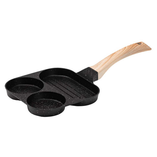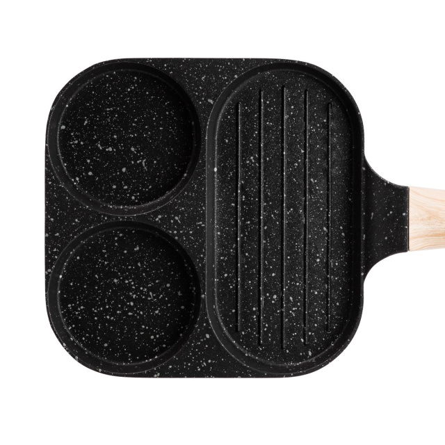 Сковорода квадратная порционная на 3 секции – удобное решение для приготовления разнообразных блюд. Изготовлена из алюминия с антипригарным покрытием, она разделена на три секции, одна из которых имеет рифленое дно, идеально подходящее для жарки мяса или овощей с характерными полосками гриля. Удобная не нагреваемая ручка защищает ваши руки от ожогов. Антипригарное покрытие эффективно предотвращает пригорание даже без использования масла. Уникальная конструкция дна обеспечивает отличную теплопроводность и равномерное распределение температуры по всей поверхности сковороды. Толстое дно гарантирует идеальное рассеяние тепла, что способствует равномерному приготовлению блюд с насыщенным ароматом. Эта квадратная сковорода станет незаменимым ассистентом на вашей кухне! Рекомендации по использованию сковороды: Рекомендуется готовить на малом или среднем огне. Используйте силиконовые или деревянные столовые приборы для защиты поверхности от царапин. Категорически не рекомендуется использовать металлические ложки и кухонные лопатки. Чтобы избежать повреждения, следует мыть сковороду только после полного охлаждения, не использовать жесткие мочалки, щетки, абразивные пасты и чистящие порошки, агрессивные вещества. Основные характеристики сковороды: размер сковороды 19×19×2 см; высота стенок сковороды 2 см; объем большей секции 220 мл; объем меньших секций по 120 мл; толщина стен 3 мм; материал ручки – бакелит; антипригарное покрытие. Преимущества сковороды: сковорода подходит для газовых и электрических плит; безопасное антипригарное покрытие без вредных соединений; гранитное покрытие для предотвращения прилипания пищи и равномерного распределения тепла; эргономичная ручка, которая не нагревается в процессе приготовления; квадратная форма для экономии места на варочной поверхности.