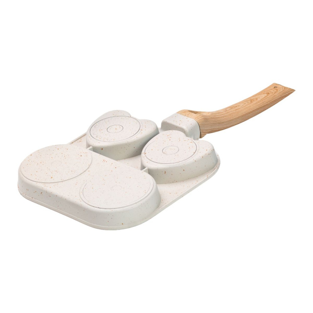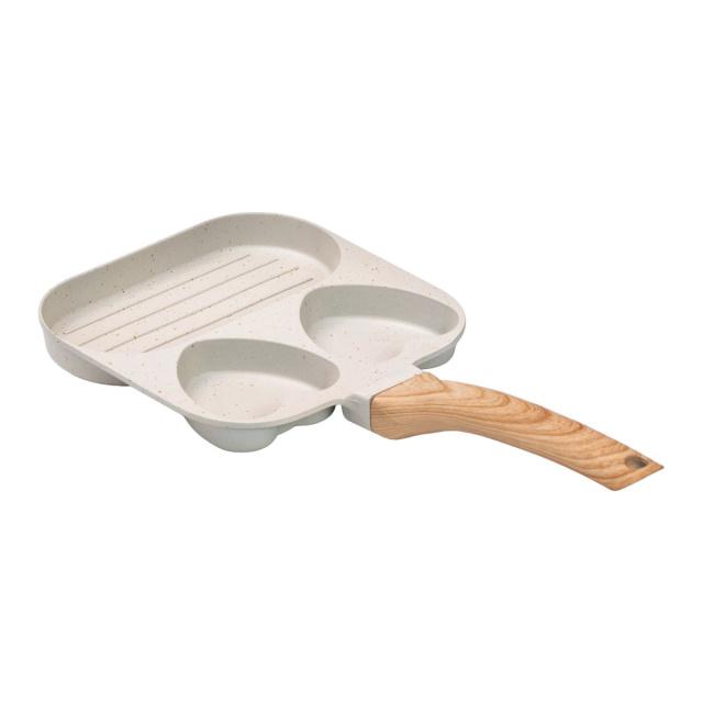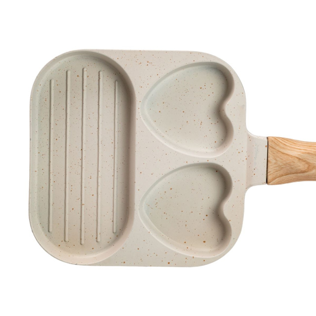 Сковорода квадратная порционная на 3 секции – это удобный инструмент для приготовления разнообразных блюд, обеспечивая возможность готовить несколько компонентов на одной сковороде. Изготовлена из алюминия с антипригарным покрытием, сковорода разделена на три секции, одна из которых имеет рифленое дно, что позволяет создавать блюда с характерными полосками гриля. Удобная не нагреваемая ручка защищает ваши руки от ожогов, добавляя комфорта во время использования. Антипригарное покрытие эффективно предотвращает пригорание пищи, позволяя готовить без использования масла. Уникальная конструкция дна способствует отличной теплопроводности и равномерному распределению температуры по всей поверхности сковороды. Толстое дно обеспечивает идеальное рассеяние тепла, что способствует равномерному приготовлению блюд с насыщенным ароматом. Эта квадратная сковорода станет вашим надежным помощником в приготовлении вкусных блюд. Меры предосторожности при использовании сковороды: Рекомендуется готовить на малом или среднем огне. Чтобы защитить поверхность от царапин, используйте силиконовые или деревянные столовые приборы. Категорически не рекомендуется использовать металлические ложки и кухонные лопатки. Чтобы избежать повреждения, следует мыть сковороду только после полного охлаждения, не использовать жесткие мочалки, щетки, абразивные пасты и чистящие порошки, агрессивные вещества. Основные характеристики сковороды: размер сковороды 18×18×2 см; высота стенок сковороды 2 см; объем большей секции 200 мл; объем меньших секций по 100 мл; толщина стен 2 мм; материал ручки – бакелит; антипригарное покрытие. Преимущества сковороды: сковорода подходит для газовых и электрических плит; безопасное антипригарное покрытие без вредных соединений; гранитное покрытие для предотвращения прилипания пищи и равномерного распределения тепла; эргономичная ручка, которая не нагревается в процессе приготовления; квадратная форма для экономии места на варочной поверхности.