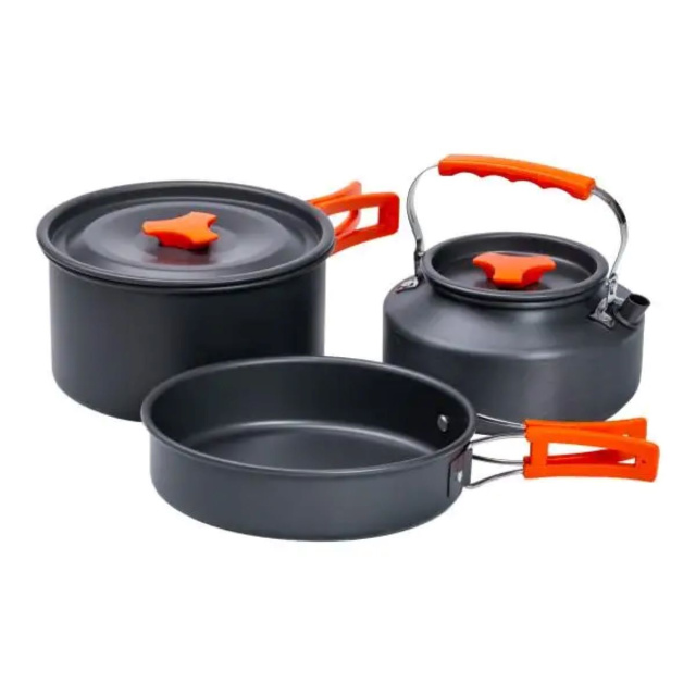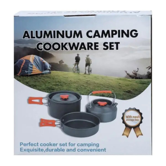 Этот набор посуды для кемпинга в сумке изготовлен из прочного алюминия, что обеспечивает его длительное использование даже в суровых условиях. Идеально подходит для кемпинга, походов и рыбалки. Благодаря складным ручкам, посуду можно компактно сложить, разместив ее поочередно внутри друг друга. Конструкция набора по принципу неваляшки позволяет ему занимать минимум места, что делает транспортировку удобной. Посуда легко моется в холодной воде, и весь набор весит всего 660 г. Этот набор посуды для кемпинга является идеальным выбором для активного отдыха на природе, позволяя удобно готовить пищу и наслаждаться трапезой в любых условиях. Основные преимущества набора походного снаряжения: Компактность и удобство: Легко складывается, занимая минимум места, и переносится в сумке. Складывающаяся ручка: Обеспечивает сохранение тепла и компактное складывание внутри котелка. Универсальность: Предназначен для использования на открытом огне. Легкость ухода за ней: Посуда легко моется в воде, даже в походных условиях. Характеристики набора: Кастрюля со складной ручкой: Диаметр 16.5 см. Высота 8,5 см. Сковорода со складной ручкой: Диаметр 17,5 см. Высота 4,0 см. Заварочный чайник: Диаметр 14,5 см Высота 8 см.