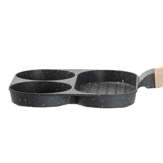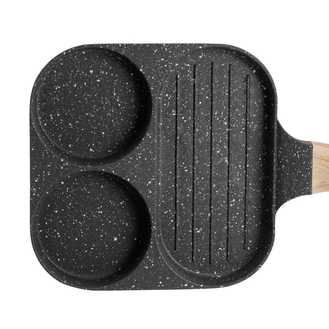 Сковорода квадратная порционная на 3 секции – удобное решение для приготовления разнообразных блюд. Изготовлена из алюминия с антипригарным покрытием, она разделена на три секции, одна из которых имеет рифленое дно, идеально подходящее для жарки мяса или овощей с характерными полосками гриля. Удобная не нагреваемая ручка защищает ваши руки от ожогов. Антипригарное покрытие эффективно предотвращает пригорание даже без использования масла. Уникальная конструкция дна обеспечивает отличную теплопроводность и равномерное распределение температуры по всей поверхности сковороды. Толстое дно гарантирует идеальное рассеяние тепла, что способствует равномерному приготовлению блюд с насыщенным ароматом. Эта квадратная сковорода станет незаменимым ассистентом на вашей кухне! Рекомендации по использованию сковороды: Рекомендуется готовить на малом или среднем огне. Используйте силиконовые или деревянные столовые приборы для защиты поверхности от царапин. Категорически не рекомендуется использовать металлические ложки и кухонные лопатки. Чтобы избежать повреждения, следует мыть сковороду только после полного охлаждения, не использовать жесткие мочалки, щетки, абразивные пасты и чистящие порошки, агрессивные вещества. Основные характеристики сковороды: размер сковороды 19×19×2 см; высота стенок сковороды 2 см; объем большей секции 220 мл; объем меньших секций по 120 мл; толщина стен 3 мм; материал ручки – бакелит; антипригарное покрытие. Преимущества сковороды: сковорода подходит для газовых и электрических плит; безопасное антипригарное покрытие без вредных соединений; гранитное покрытие для предотвращения прилипания пищи и равномерного распределения тепла; эргономичная ручка, которая не нагревается в процессе приготовления; квадратная форма для экономии места на варочной поверхности.
