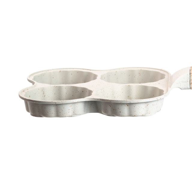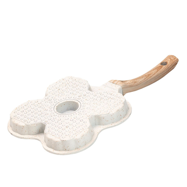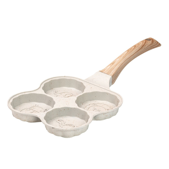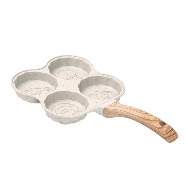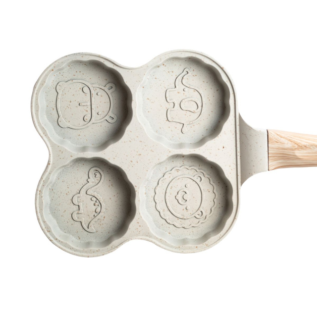Сковорода для оладий, блинов и оладьев изготовлена из алюминия с антипригарным покрытием. Сковорода разделена на четыре круга, а дно выполнено в форме животного. Антипригарное покрытие предотвращает пригорание. Уникальный дизайн дна обеспечивает отличную теплопроводность и равномерное распределение температуры по всей поверхности сковороды. Основные характеристики сковороды Размер сковороды 19,5 x 19,5 x 2,5 смВысота сковороды 2,4 смОбъем одного уровня 120 млТолщина стенок 3 мм;Материал ручки - бакелит;Антипригарное покрытие. Преимущества блинной сковороды. Подходит для газовых и электрических плит;Не вступает в реакцию с пищей;Одновременно можно приготовить 4 блина, оладьи и яичницу. Рекомендации по использованию. Рекомендуется готовить на слабом или среднем огне.Используйте силиконовые или деревянные столовые приборы, чтобы защитить поверхность от царапин. Не используйте металлические ложки или лопатки.Во избежание повреждений мойте сковороду только после полного остывания. Не используйте жесткие губки, щетки, абразивные пасты и порошки, а также другие агрессивные чистящие средства. Поддерживайте хорошее настроение себе и своим близким во время подачи блюд. Сковороды для оладий могут быть доставлены по всей Украине.