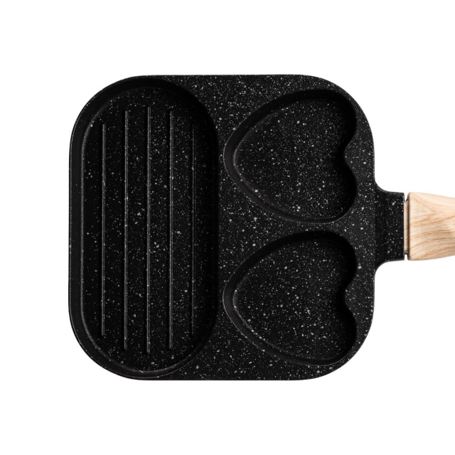 Сковорода квадратная порционная на 3 секции – это удобный инструмент для приготовления разнообразных блюд, обеспечивая возможность готовить несколько компонентов на одной сковороде. Изготовлена из алюминия с антипригарным покрытием, сковорода разделена на три секции, одна из которых имеет рифленое дно, что позволяет создавать блюда с характерными полосками гриля. Удобная не нагреваемая ручка защищает ваши руки от ожогов, добавляя комфорта во время использования. Антипригарное покрытие эффективно предотвращает пригорание пищи, позволяя готовить без использования масла. Уникальная конструкция дна способствует отличной теплопроводности и равномерному распределению температуры по всей поверхности сковороды. Толстое дно обеспечивает идеальное рассеяние тепла, что способствует равномерному приготовлению блюд с насыщенным ароматом. Эта квадратная сковорода станет вашим надежным помощником в приготовлении вкусных блюд. Меры предосторожности при использовании сковороды: Рекомендуется готовить на малом или среднем огне. Чтобы защитить поверхность от царапин, используйте силиконовые или деревянные столовые приборы. Категорически не рекомендуется использовать металлические ложки и кухонные лопатки. Чтобы избежать повреждения, следует мыть сковороду только после полного охлаждения, не использовать жесткие мочалки, щетки, абразивные пасты и чистящие порошки, агрессивные вещества. Основные характеристики сковороды: размер сковороды 18×18×2 см; высота стенок сковороды 2 см; объем большей секции 200 мл; объем меньших секций по 100 мл; толщина стен 2 мм; материал ручки – бакелит; антипригарное покрытие. Преимущества сковороды: сковорода подходит для газовых и электрических плит; безопасное антипригарное покрытие без вредных соединений; гранитное покрытие для предотвращения прилипания пищи и равномерного распределения тепла; эргономичная ручка, которая не нагревается в процессе приготовления; квадратная форма для экономии места на варочной поверхности.