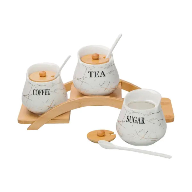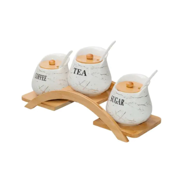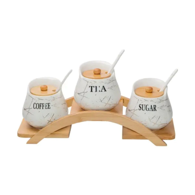 Этот кухонный набор включает три керамические банки объемом 500 мл для хранения сахара, кофе и чая. В комплект входят крышка и ложка, чтобы легко вынимать содержимое и сохранять его свежим. В комплект входит деревянная подставка, чтобы их можно было удобно разместить на кухонном столе или полке. Основные характеристики набора контейнеров для чая, кофе и сахара Размер набора 37 x 13,5 x 17 см Объем 500 мл Материал банки - керамика Материал подставки - бамбук Этот набор выполняет не только функциональную роль, но и является прекрасным декоративным элементом. Он делает кухню уютной и удобной для организации. Набор легко моется, практичен и долговечен. Доставка осуществляется по всей Украине.