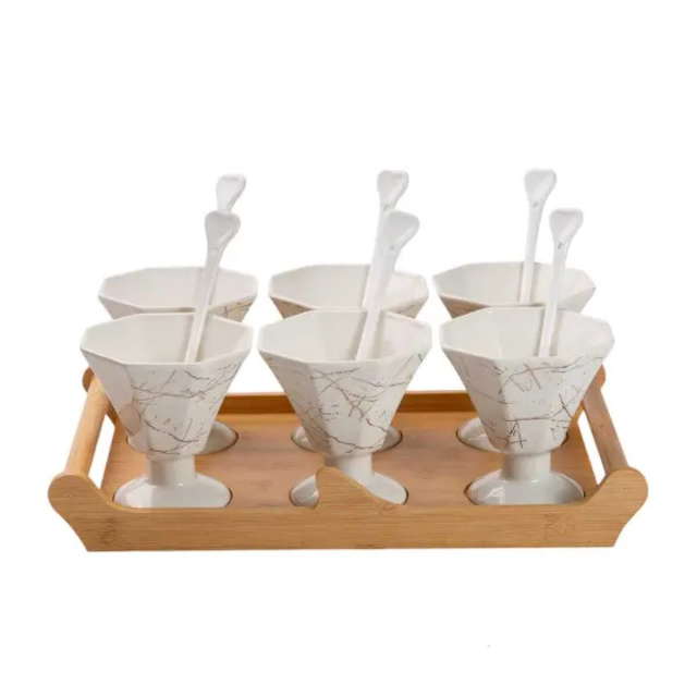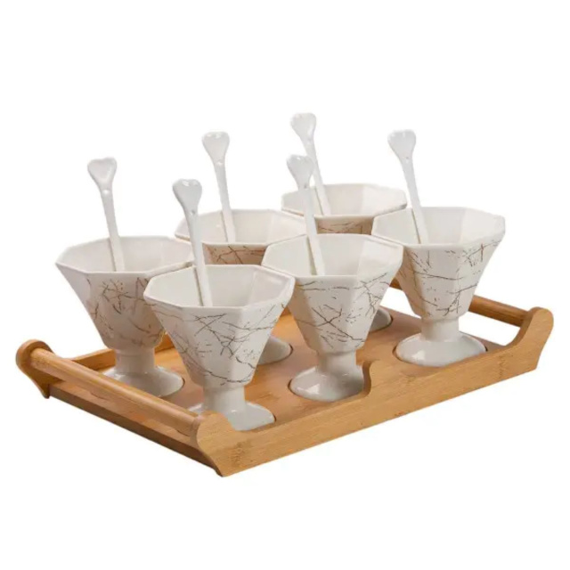 Элегантные креманки в наборе из шести штук. Изготовленные из белой фарфора, они идеально подходят для подачи различных десертов, свежих фруктов, холодного мороженого и освежающих салатов. Основные характеристики набора креманок 6 креманок, с ложкой Объем 200 мл Размер набора 36,5 x 23 x 18 см Деревянная подставка Ножка не только подчеркивает красоту, но и обеспечивает комфорт при держании. Этот набор - идеальный подарок для тех, кто хочет добавить элемент изысканности в свой домашний декор. Оперативная доставка во все регионы Украины.