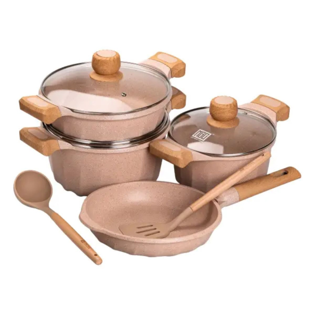 Набор посуды, 3 кастрюли, сковорода, алюминиевая толстодонная MGC с лопаткой и половником, бежевый HP-4-401CR