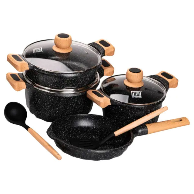 UA MarketОдесаПотребенькиТовари та послугиПосуда для готовкиКастрюлиНабор посуды, 3 кастрюли, с толстодонной алюминиевой лопаткой и половником MGC, черный HP-4-401B