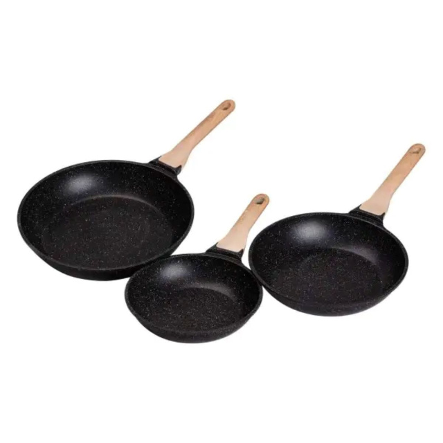 Набор сковородок с толстым дном обеспечивает равномерную передачу тепла и эффективное приготовление пищи. Покрытие сковороды равномерно передает тепло, что позволяет быстро и равномерно обжаривать продукты без риска подгорания. Удобные не нагревающиеся ручки защитят ваши руки от ожогов. Уникальная конструкция дна обеспечивает отличную теплопроводность и равномерное распределение температуры по всей поверхности. Ключевые особенности набора сковородок MGC Малая сковорода Диаметр 20 см; Объем 1,2 л Средняя сковорода Диаметр 24 см; Объем 2 литра. Большая сковорода Диаметр 28 см; Объем 3 литра. Преимущества сковороды MGC Подходит для газовых, электрических и индукционных плит; Безопасное антипригарное покрытие, не содержащее вредных соединений; Керамическое покрытие предотвращает прилипание пищи и обеспечивает равномерную передачу тепла; Эргономичные ручки, которые не нагреваются во время приготовления пищи. Инструкция по применению. Перед первым использованием вымойте сковороду в теплой воде с мягким моющим средством и губкой и вытрите насухо. После полного высыхания протрите антипригарное покрытие небольшим количеством растительного масла. Используйте силиконовые или деревянные столовые приборы, чтобы защитить поверхность от царапин. Категорически не рекомендуется использовать металлические ложки или лопатки. Во избежание повреждений мойте сковороды только после полного остывания. Не используйте жесткие губки, щетки, абразивные пасты, чистящие порошки и агрессивные вещества. Набор сковородок из 3 предметов сочетает в себе высокую функциональность и стильный дизайн. Алюминиевые сковороды - это надежный помощник в приготовлении вкусной и здоровой пищи для всей семьи.