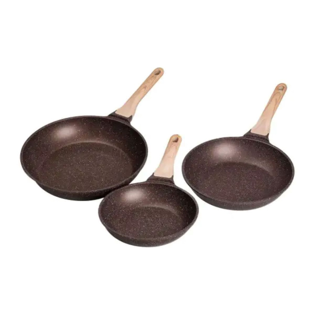 Набор сковородок с толстым дном обеспечивает равномерную передачу тепла и эффективное приготовление пищи. Покрытие сковороды равномерно передает тепло, что позволяет быстро и равномерно обжаривать продукты без риска подгорания. Удобные не нагревающиеся ручки защитят ваши руки от ожогов. Уникальная конструкция дна обеспечивает отличную теплопроводность и равномерное распределение температуры по всей поверхности. Ключевые особенности набора сковородок MGC Малая сковорода Диаметр 20 см; Объем 1,2 л Средняя сковорода Диаметр 24 см; Объем 2 литра. Большая сковорода Диаметр 28 см; Объем 3 литра. Преимущества сковороды MGC Подходит для газовых, электрических и индукционных плит; Безопасное антипригарное покрытие, не содержащее вредных соединений; Керамическое покрытие предотвращает прилипание пищи и обеспечивает равномерную передачу тепла; Эргономичные ручки, которые не нагреваются во время приготовления пищи. Инструкция по применению. Перед первым использованием вымойте сковороду в теплой воде с мягким моющим средством и губкой и вытрите насухо. После полного высыхания протрите антипригарное покрытие небольшим количеством растительного масла. Используйте силиконовые или деревянные столовые приборы, чтобы защитить поверхность от царапин. Категорически не рекомендуется использовать металлические ложки или лопатки. Во избежание повреждений мойте сковороды только после полного остывания. Не используйте жесткие губки, щетки, абразивные пасты, чистящие порошки и агрессивные вещества. Набор сковородок из 3 предметов сочетает в себе высокую функциональность и стильный дизайн. Алюминиевые сковороды - это надежный помощник в приготовлении вкусной и здоровой пищи для всей семьи.