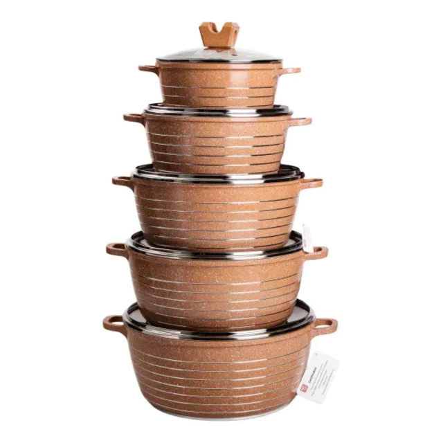 Набор кастрюль с крышками и толстым дном для равномерного распределения тепла и эффективного приготовления пищи. Каждая кастрюля оснащена крышкой из прочного жаропрочного стекла и пароотводом для уменьшения испарения и сохранения тепла. Это делает приготовление пищи еще более удобным и эффективным. Кастрюли легко мыть в посудомоечной машине. Основные характеристики набора Кастрюля объемом 9 литров Диаметр 32 см Высота кастрюли без крышки 14,5 см Высота кастрюли с крышкой 19,5 см Кастрюля объемом 7 литров Диаметр 30 см; Высота кастрюли без крышки 14 см; Высота кастрюли с крышкой 19 см Кастрюля объемом 5 литров Диаметр 28 см; Высота кастрюли без крышки 12,5 см; Высота кастрюли с крышкой 17,5 см; Кастрюля объемом 4 л. Диаметр 24 см; Высота кастрюли без крышки 11,5 см; Высота кастрюли с крышкой 16,5 см Кастрюля объемом 2,5 л. Диаметр 20 см; Высота кастрюли без крышки 9 см; Высота кастрюли с крышкой 14 см. Этот набор кастрюль подходит для всех типов плит - индукционных, газовых и электрических, что делает его универсальным решением для любой кухни. Алюминиевые кастрюли и сковороды - надежный помощник в приготовлении вкусной и здоровой пищи для всей семьи.