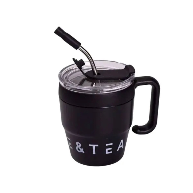 Термокружка с ручкой 480 мл – это практичный и удобный аксессуар, который позволит вам наслаждаться любимым напитком, будь то горячий кофе, ароматный чай или освежающий сок, в любом месте и в любое время. Внутренняя колба изготовлена из высококачественной нержавеющей стали - этот материал является безопасным для здоровья, не накапливает запахи и не влияет на вкус напитка. Черная матовая термокружка объединяет в себе сразу два формата для комфортного питья: металлическую трубочку; отверстие с клапаном. Оба отверстия надежно закрываются защитными герметичными клапанами, которые предотвращают пролитие напитка. Основные характеристики объем 480 мл; высота 10 см; диаметр 6 см. Основные преимущества Термокружка с вакуумной изоляцией способна сохранять температуру напитка в течение нескольких часов. Ручка обеспечивает удобный хват, даже если ваша рука в перчатке. Крышка термокружки плотно закрывается, что защищает напиток от пролития. Термокружка незаменима в дороге, в спорт зале, на прогулках и пикниках. Она прекрасно удерживает тепло или холод, сохраняя температуру напитков. Вы сможете долго лакомиться горячим ароматным чаем или идеально ледяным лимонадом.