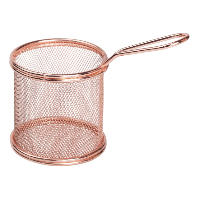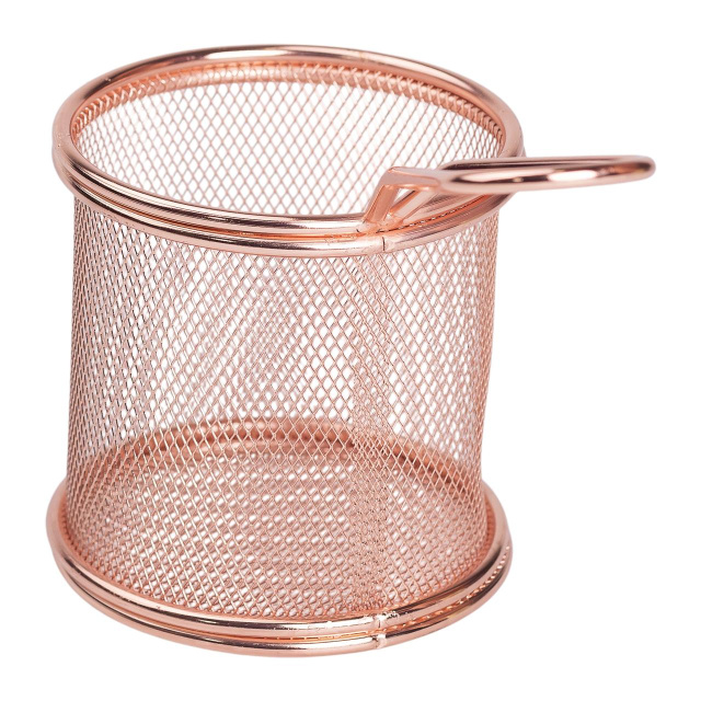 Оригинальная корзина для подачи снеков станет стильным акцентом вашего стола. Изготовлена из высококачественной нержавеющей стали с гальваническим покрытием, она сочетает современный вид с долговечностью. Компактный размер позволяет удобно подавать порционные закуски, сохраняя аппетитный вид. Основные характеристики: Материал: нержавеющая сталь; Размер: 9×9×9 см; Высота с ручкой: 12 см; Глубина: 8 см; Толщина проволоки: 0.5 мм. Благодаря своему дизайну и прочной конструкции корзина подходит для подачи картофеля фри, чипсов, хлебных палочек или других легких блюд. Металлический каркас обеспечивает легкость и стабильность, а покрытие гарантирует устойчивость к воздействию влаги и износу. Простота в уходе и возможность использования корзины в домашних условиях или для сервировки в заведениях делают ее универсальным решением.