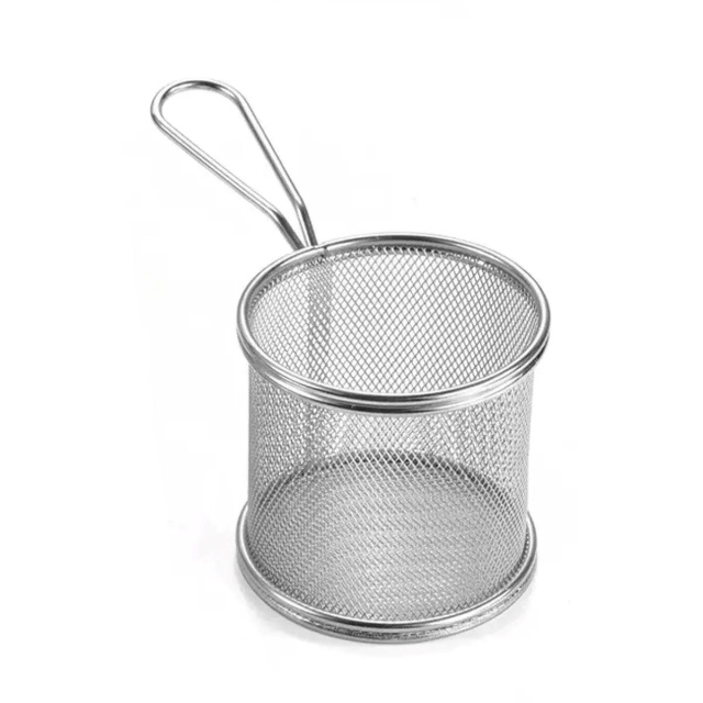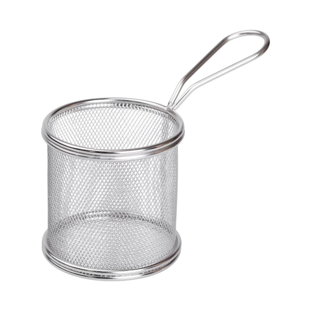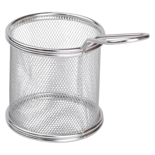 Оригинальная корзина для подачи снеков и картофеля фри станет стильным акцентом вашего стола. Изготовлена из высококачественной нержавеющей стали, она сочетает современный вид с долговечностью. Компактный размер позволяет удобно подавать порционные закуски, сохраняя аппетитный вид. Основные характеристики: Материал: нержавеющая сталь; Размер: 9×9×9 см; Высота с ручкой: 12 см; Глубина: 8 см; Толщина проволоки: 0.5 мм. Благодаря своему дизайну и прочной конструкции корзина подходит для подачи картофеля фри, чипсов, хлебных палочек или других легких блюд. Металлический каркас обеспечивает легкость и стабильность, а покрытие гарантирует устойчивость к воздействию влаги и износу. Простота в уходе и возможность использования корзины в домашних условиях или для сервировки в заведениях делают ее универсальным решением.