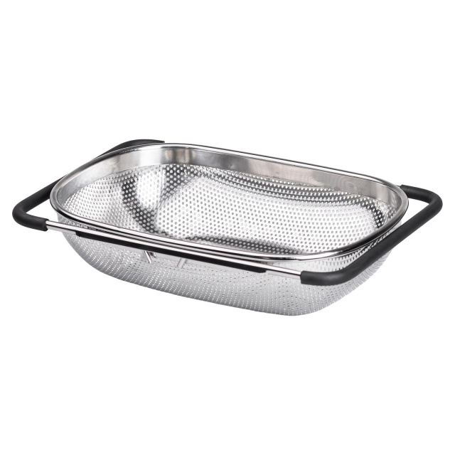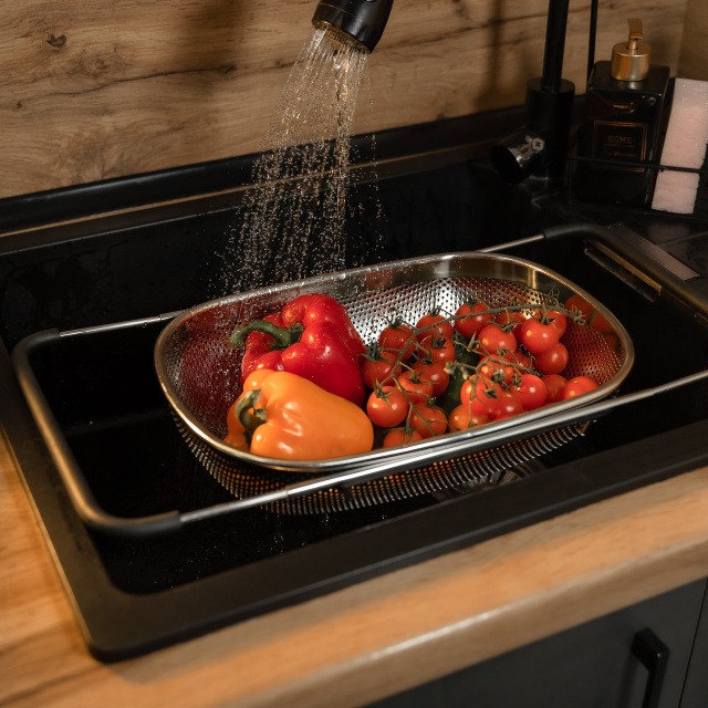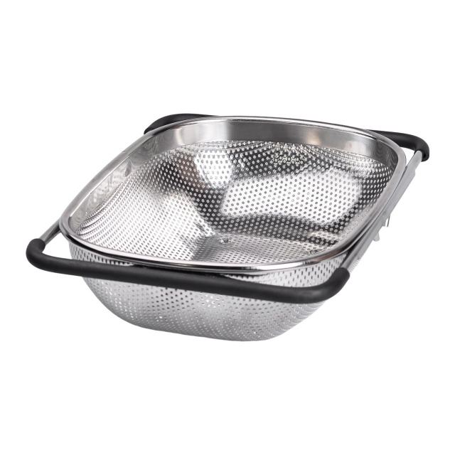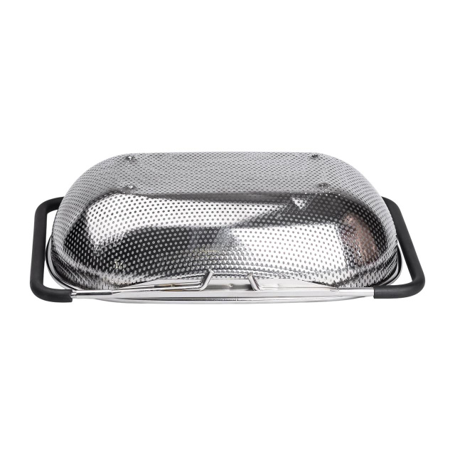 Сито-дуршлаг с телескопическими ручками – это удобный и практичный кухонный аксессуар предназначенный для эффективного мытья, сушки и процеживания овощей, фруктов, макаронных изделий и других продуктов. Его конструкция позволяет удобно закреплять изделие на бортах раковины, обеспечивая стабильность в процессе использования. Основные характеристики размер 36х24х9 см; длина с ручками 51 см; глубина 8 см; материал - нержавеющая сталь. Преимущества и особенности: Прочная конструкция – выполнен из высококачественной нержавеющей стали, устойчивой к коррозии и механическим повреждениям. Эргономичность – телескопические ручки с ПВХ-накладками обеспечивают надежную фиксацию на раковине, предотвращая скольжение. Многофункциональность – подходит для процеживания, промывания, сушки продуктов и даже использования в качестве паровой корзины. Компактность и удобство хранения – благодаря раздвижным ручкам дуршлаг легко адаптируется под разные размеры раковин и не занимает много места при хранении. Рекомендуется для использования как в домашних условиях, так и в профессиональной кухне кафе, ресторанов и столовых. Идеально подходит для мытья зелени, овощей, фруктов и процеживания пасты. Продуманный дизайн делает его универсальным для выполнения разных кухонных задач.