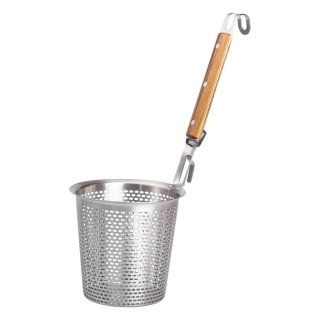 Сито из нержавеющей стали для фритюра и варки макарон – универсальный аксессуар для домашней и профессиональной кухни, который имеет множество вариантов применения. Глубокое сито из нержавеющей стали с маленькими круглыми отверстиями идеально подходит для процеживания жареных и приготовленных ингредиентов, таких как макароны, пельмени или овощи в темпуре. Также подходит для быстрого приготовления и бланширования продуктов прямо в ситечке. Основные характеристики размер 14.2х14.2х13 см. высота с ручкой 34 см. глубина 13 см. вес 280 г. тип поверхности - перфорированный металл. Сито подходит для быстрого приготовления продуктов на пару или в горячем масле мясных, овощных, рыбных закусок, и позволяет практически сразу избавиться от лишнего жира.