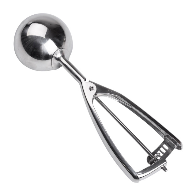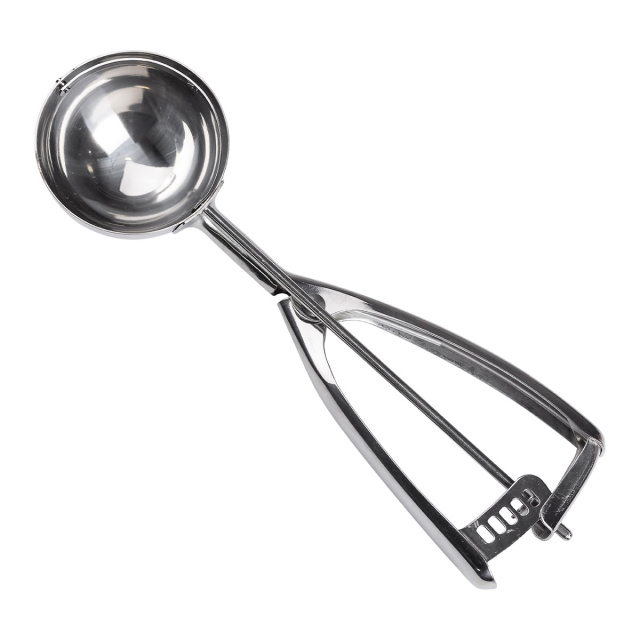 Ложка для мороженого – незаменимый аксессуар для заведений общественного питания, кондитерских где подаются прохладительные десерты. Круглая ложка для мороженого представляет собой профессиональный инструмент для формирования идеальных шариков мороженого, сорбета и других замороженных десертов. Ложка изготовлена из нержавеющей стали и оснащена пружинным механизмом, который легко приводится в действие. Таким образом шарики быстро выталкиваются из полусферы, что позволяет ускорить рабочий процесс. Основные характеристики ложки для мороженного Материал: высококачественная нержавеющая сталь. Размеры 22×6.5×3.5 см. Диаметр рабочей части: 6.5 см. Толщина стенок: 1 мм. Вес: 140 г. Конструктивные особенности Оснащена удобным механическим механизмом выброса, обеспечивающим легкое извлечение мороженого без прилипания. Эргономичная ручка с усиленной конструкцией для удобного захвата и длительного срока службы. Устойчивость к коррозии благодаря высокопрочной нержавеющей стали. Легкость в очистке и возможность мытья в посудомоечной машине. Ложка предназначена для профессионального и домашнего использования в кафе, ресторанах, кондитерских, а также в бытовых условиях. Может использоваться не только для мороженого, но и для порционного теста, картофельного пюре, арбузных шариков и других продуктов. Ложка для мороженого — незаменимый помощник для профессионалов и любителей кулинарии, обеспечивающий идеальную подачу блюд.