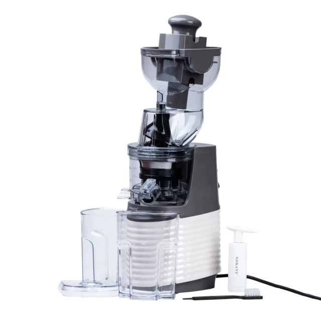 Соковыжималка Sokany JE-32 - это удобное и эффективное устройство для получения свежих соков, в частности из томатов. Мощность 300 Вт обеспечивает быстрый и бесперебойный отжим сока, что делает ее идеальной для домашнего использования. Одна скорость работы и функция реверса позволяют легко настроить процесс отжима, обеспечивая удобство приготовления свежих напитков из различных фруктов и овощей. Основные характеристики соковыжималки Sokany мощность 300 Вт; длина шнура питания 1.07 м; материал корпуса - пластик; материал шнека - нержавеющая сталь. Особенностью этой модели является наличие сетки, которая не забивается во время использования, что позволяет без проблем получить чистый сок без семян. Кроме того, в комплекте есть специальная щетка для очистки, что облегчает уход за соковыжималкой и обеспечивает ее долговечность. Соковыжималка не имеет емкостей для сока и жмыха, поэтому их нужно дополнительно приобрести, а также нужно нарезать продукты перед использованием. Простота в эксплуатации и возможность настройки положения шнека (повернув отверстие на 180 градусов) делает процесс работы с соковыжималкой еще более удобным. Продукты можно вставлять и пропихивать толкателем, что позволяет работать с разнообразными ингредиентами без лишних трудностей.