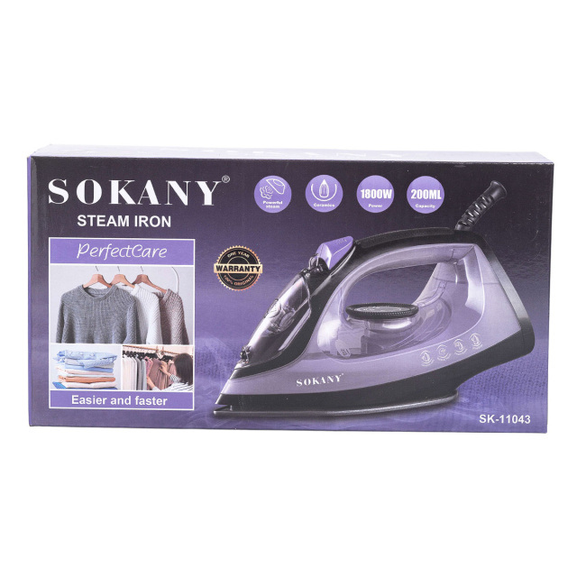 Утюг SOKANY SK-11043 — мощный и удобный прибор для ежедневного использования, который обеспечивает быструю и эффективную глажку. Мощность 1800 Вт гарантирует быстрый нагрев и стабильную работу прибора, что позволяет эффективно выглаживать различные ткани. Благодаря металлокерамической подошве утюг скользит по ткани без труда, не оставляя следов и обеспечивая равномерное распределение тепла для лучшего результата. Основные характеристики: размер 26х11х13 см; мощность 1800 Вт; объем резервуара для воды 200 мл; материал подошвы металлокерамика; длина шнура питания 1.4 метра; 3 режима работы. Благодаря длинному шнуру питания (1.4 м) утюг позволяет удобно пользоваться им даже на больших площадях, не ограничивая свободы движения. Резервуар для воды объемом 200 мл дает возможность гладить без необходимости часто доливать воду, что придает удобство при длительном использовании. Утюг имеет все необходимые функции для удобства пользователя, в частности регулировку температуры, что позволяет адаптировать ее к разным типам тканей, и паровой удар для более эффективного удаления складок.