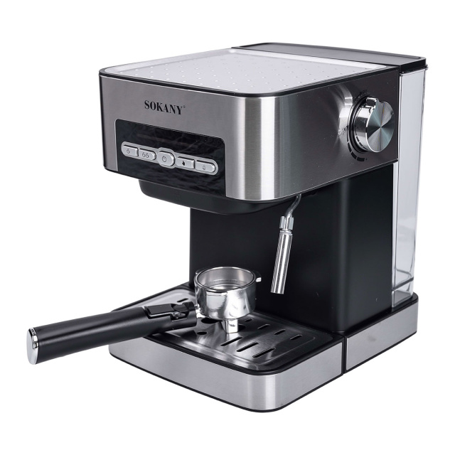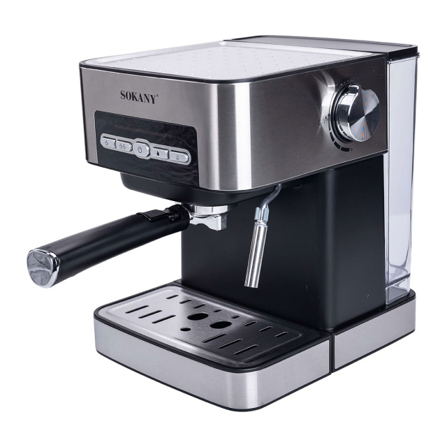 Электрическая кофемашина Sokany - это современная полуавтоматическая кофеварка, которая создает идеальные напитки благодаря сочетанию инновационных функций и профессионального подхода к приготовлению кофе. Постоянный фильтр с ручкой позволяет удобно работать с молотым кофе, а съемный поддон для сбора капель легко очищается, обеспечивая гигиеничность. Благодаря функции пара и горячей воды, вы можете не только приготовить кофе, но и вспенить молоко для идеального капучино или латте. Основные характеристики кофемашины Sokany размер 26×21×28 см; мощность 850 Вт; диапазон давления 0-15 бар; материал: нержавеющая сталь + ABS; объем резервуара для воды 1.6 литра; приготовление на 1 или 2 чашки кофе. Модель оснащена профессиональной насадкой для вспенивания, которая смешивает пар и молоко для создания густой сливочной пенки. Большой резервуар для воды объемом 1.6 л позволяет приготовить несколько порций напитков без частого пополнения. Максимальное давление в 15 бар обеспечивает идеальное прохождение воды через молотый кофе, раскрывая его аромат и создавая густую пенку. Мощность 850 Вт гарантирует быстрый нагрев и стабильную работу. Кофеварка Sokany также имеет функцию очистки от накипи, что продлевает срок службы кофемашины и сохраняет качество вкуса напитков. Благодаря компактным размерам, кофеварка удобно размещается на кухне, а ее стильный дизайн придает современный вид вашему пространству.
