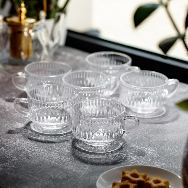 Набор стеклянных чашек станет прекрасным дополнением к любой сервировке благодаря своей элегантной простоте и универсальности. Изготовлены из высококачественного термостойкого стекла, чашки безопасны для использования в посудомоечной машине, что делает их легкими в уходе и обслуживании. Вы можете быть уверены, что они сохранят свой блеск и прозрачность даже после многократного мытья. Характеристики набора чашек количество чашек в наборе - 6 штук; объем чашки 270 мл; высота чашки 6 см; верхний диаметр 9 см; нижний диаметр 5 см; материал - стекло. Благодаря удобной форме чашки комфортно лежат в руке, а прочное стекло обеспечивает устойчивость к ежедневному использованию. Изделия гармонично сочетаются с любой сервировкой и могут использоваться как в быту, так и в кафе или ресторанах. Материал легко очищается, не впитывает запахи и не меняет вкус напитков. Чашки можно мыть вручную или в посудомоечной машине