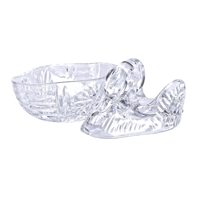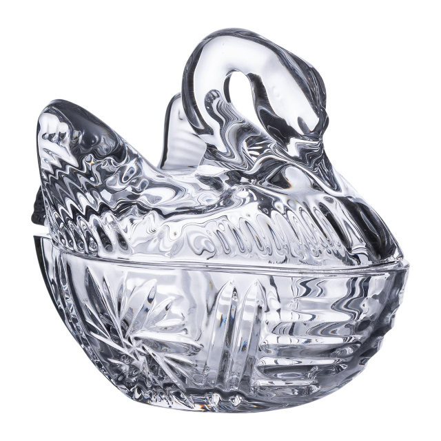 Стеклянная конфетница с крышкой в форме лебедя — это изысканное сочетание эстетики и практичности. Ее уникальный дизайн с грациозной крышкой в виде лебедя придает нотки роскоши и делает ее прекрасным элементом декора. Благодаря прозрачному стеклу содержимое конфетницы выглядит эффектно, а компактный размер позволяет использовать ее для хранения и подачи сладостей, орехов или других угощений. Основные характеристики: Материал: стекло; Размер: 14х9х11 см. Конфетница удобно размещается на столе, гармонично дополняя праздничную сервировку или повседневный интерьер. Ее эргономичная форма и оптимальный объем в 188 мл идеально подходят для небольших порций угощений. Этот аксессуар станет отличным подарком для ценителей стильной и функциональной посуды.